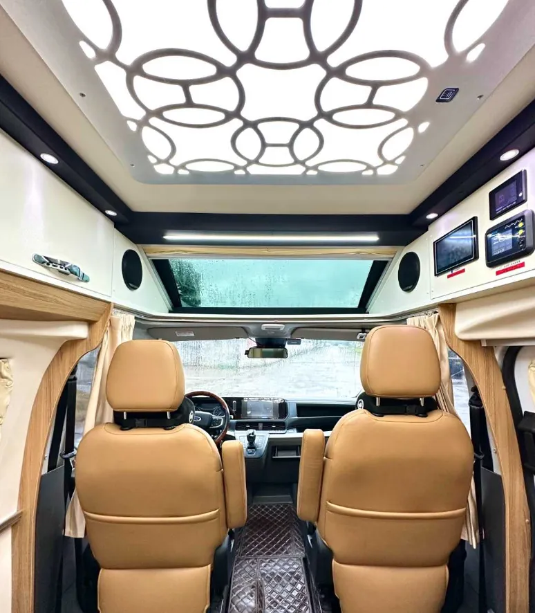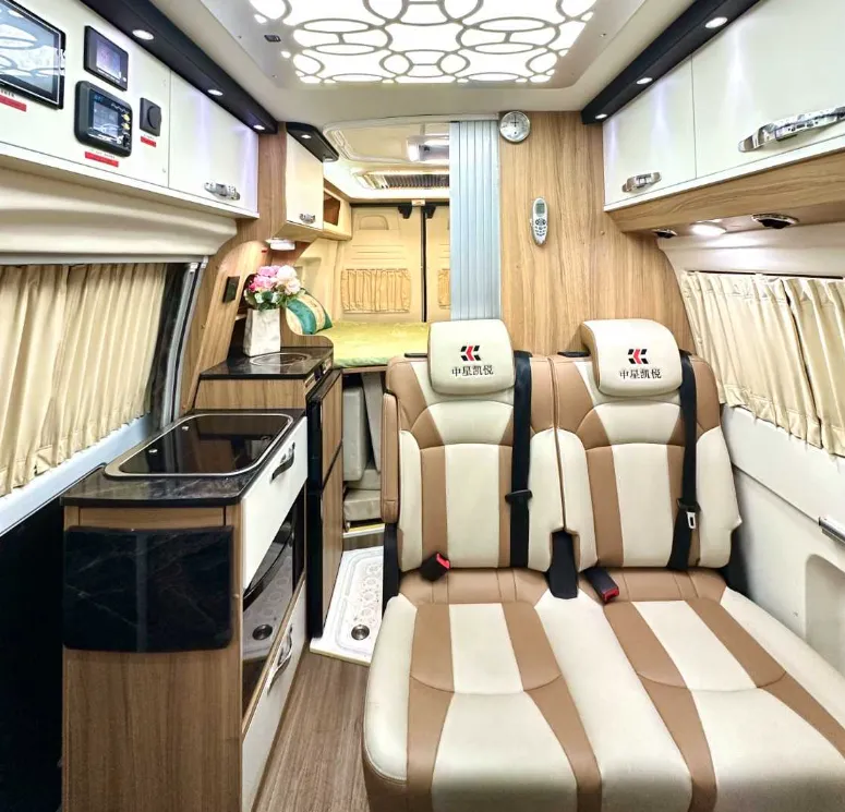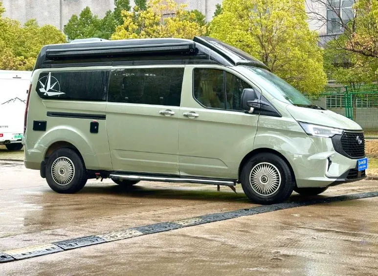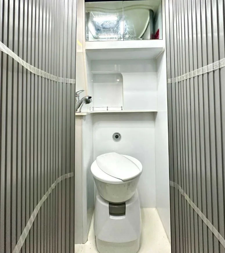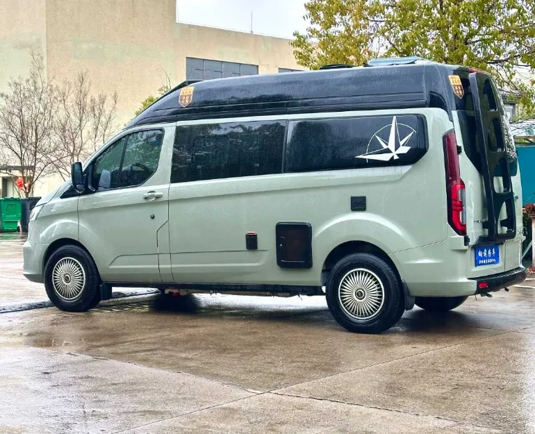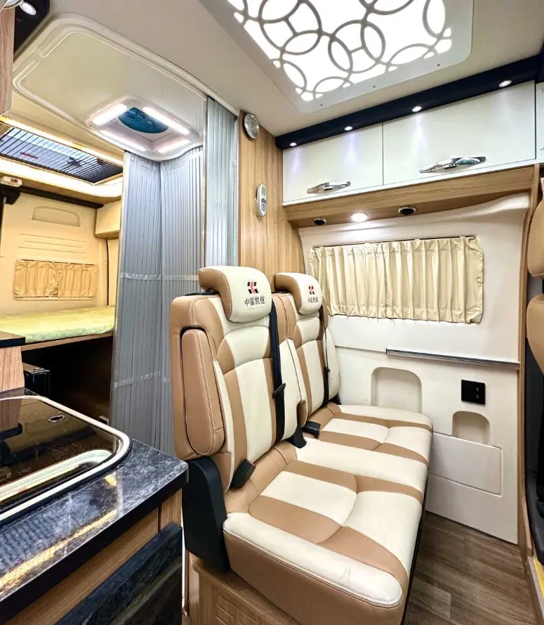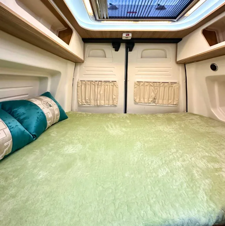 【上装配件】音响、大天窗、燃油暖风热水、五孔插座。电磁炉、洗菜池、微波炉、双开门冰箱、五孔插座。卫生间有抽拉马桶、淋浴花洒、梳妆镜、双向换气扇。遮阳棚、户外花洒、加水口、充电口、爬梯、底置备胎。
