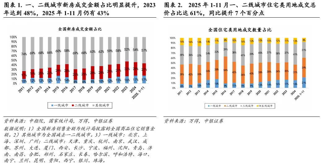 无论是从楼市还是从土地市场的角度,核心城市占全国的比例都在提升。从新房成交来看,一、二线城市新房成交占比明显提升,2023年35个一、二线城市新房成交金额占比达48%,2025年1-11月仍有43%。从更前置的土地市场成交情况来看,2025年1-11月一、二线城市住宅类用地成交总价占比达61%,同比提升7个百分点,处于2017年以来的最高水平。