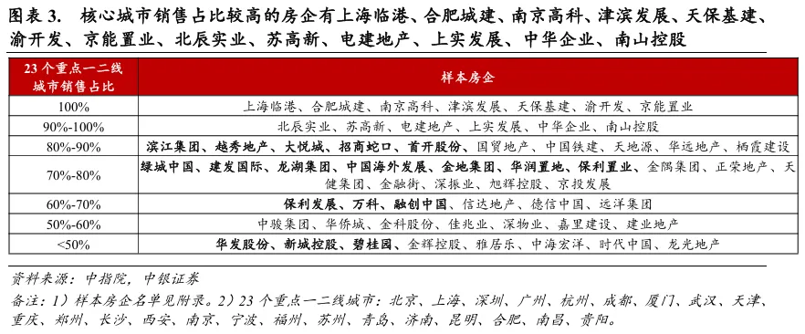 1)核心城市销售占比较高的主流房企(2025年1-11月23个重点一二线城市销售占比均值>70%)有:滨江集团、越秀地产、大悦城、招商蛇口、首开股份、绿城中国、建发国际、龙湖集团、中国海外发展、金地集团、华润置地、保利置业。