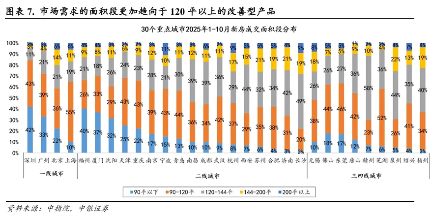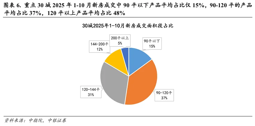 从市场需求角度来看,面积段更加趋向于120平以上的改善型产品。重点30城2025年1-10月新房成交中90平方米以下产品平均占比仅15%,90-120平方米的产品平均占比37%,120平方米以上产品平均占比48%。