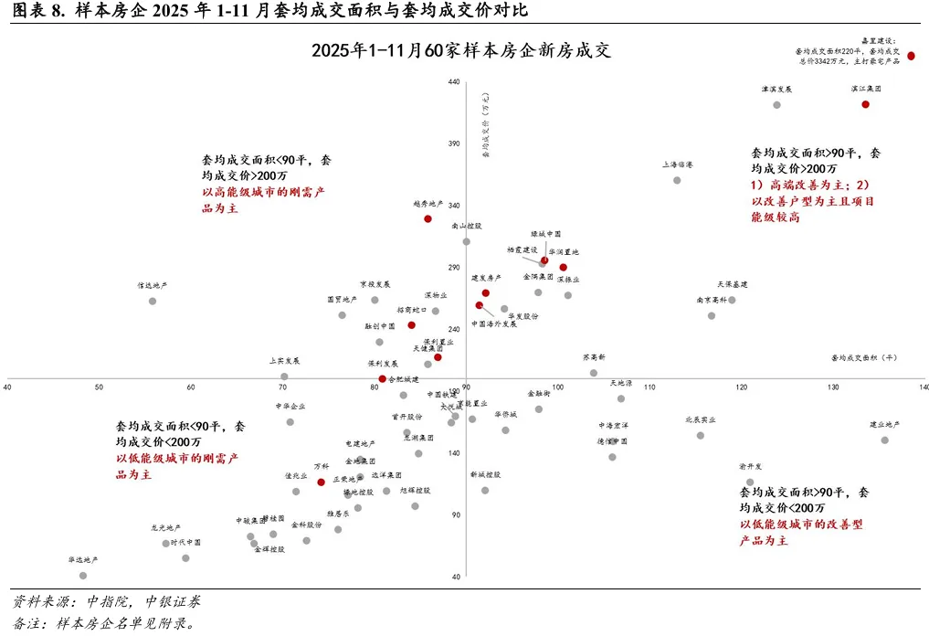 我们认为,主打改善型产品的房企更加迎合市场需求。我们跟踪了60家样本房企2025年1-11月套均成交面积与套均成交价数据,将房企分为四类: