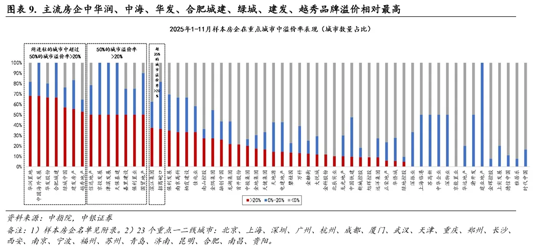 在“好房子”逻辑下,产品力突出的房企更具优势。我们认为,产品力突出的房子通常是具备品牌溢价的房企,通过重点城市参与房企的平均成交价格对比。我们用(2025年1-11月房企在具体城市中的销售均价/该城市同期整体销售均价-1)得到样本房企在各城市中的溢价率,再通过城市数量占比得到: