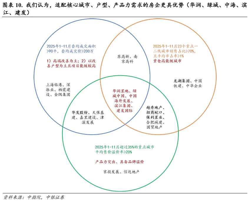 综上所述,适配核心城市、户型、产品力需求的房企更具优势,在三个维度均有优势的房企有:华润、绿城、中海、滨江、建发。主流房企中,保利置业、越秀、招蛇、华发具备其中两项优势,多为央国企或区域深耕型房企。