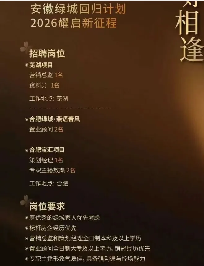 (4)要求:全日制专科及以上学历,有合肥高端住宅和低密项目销售经验、销冠优先。