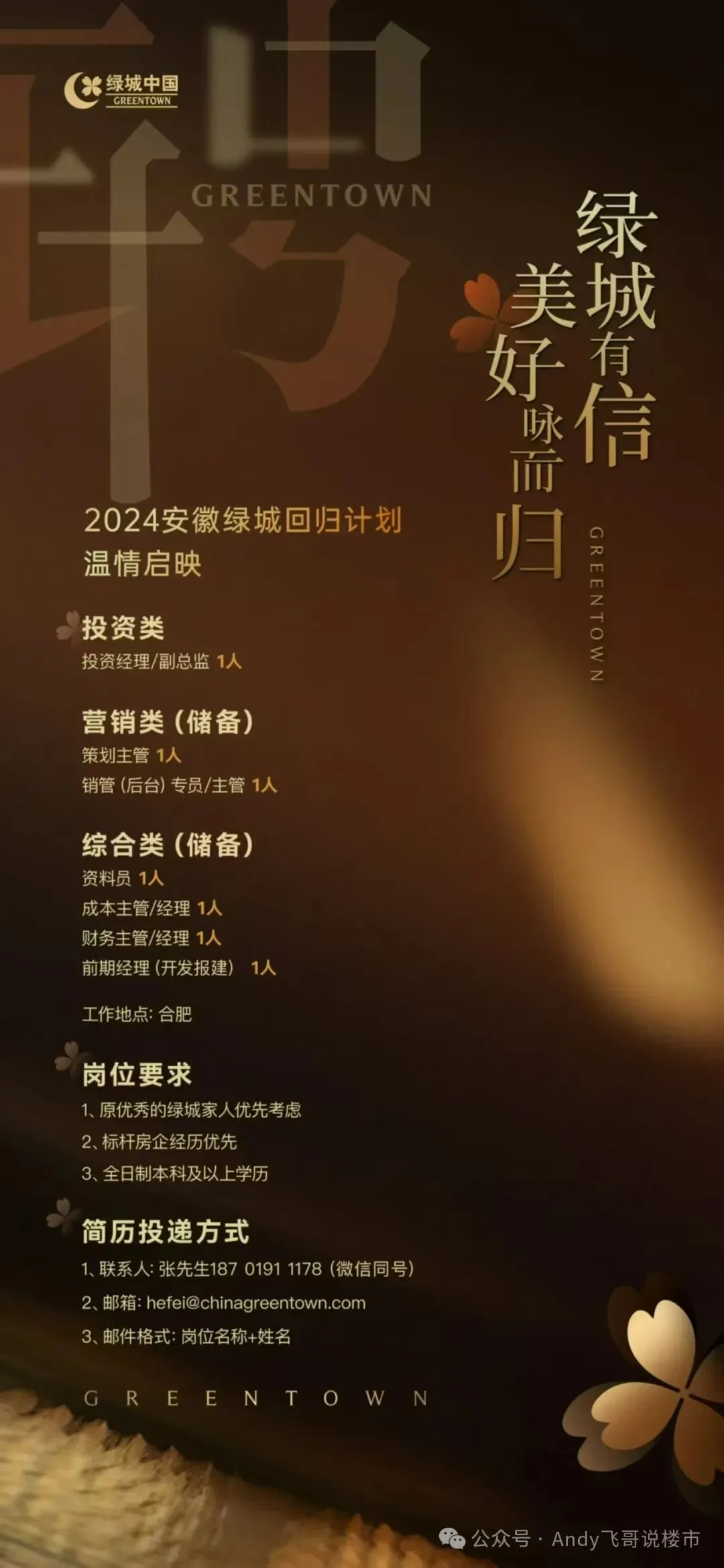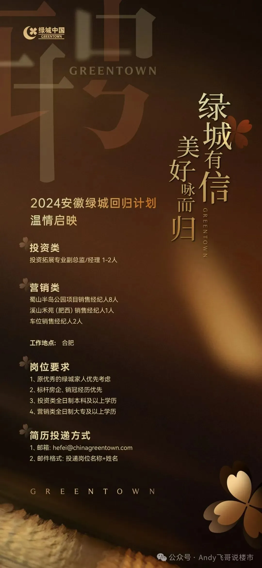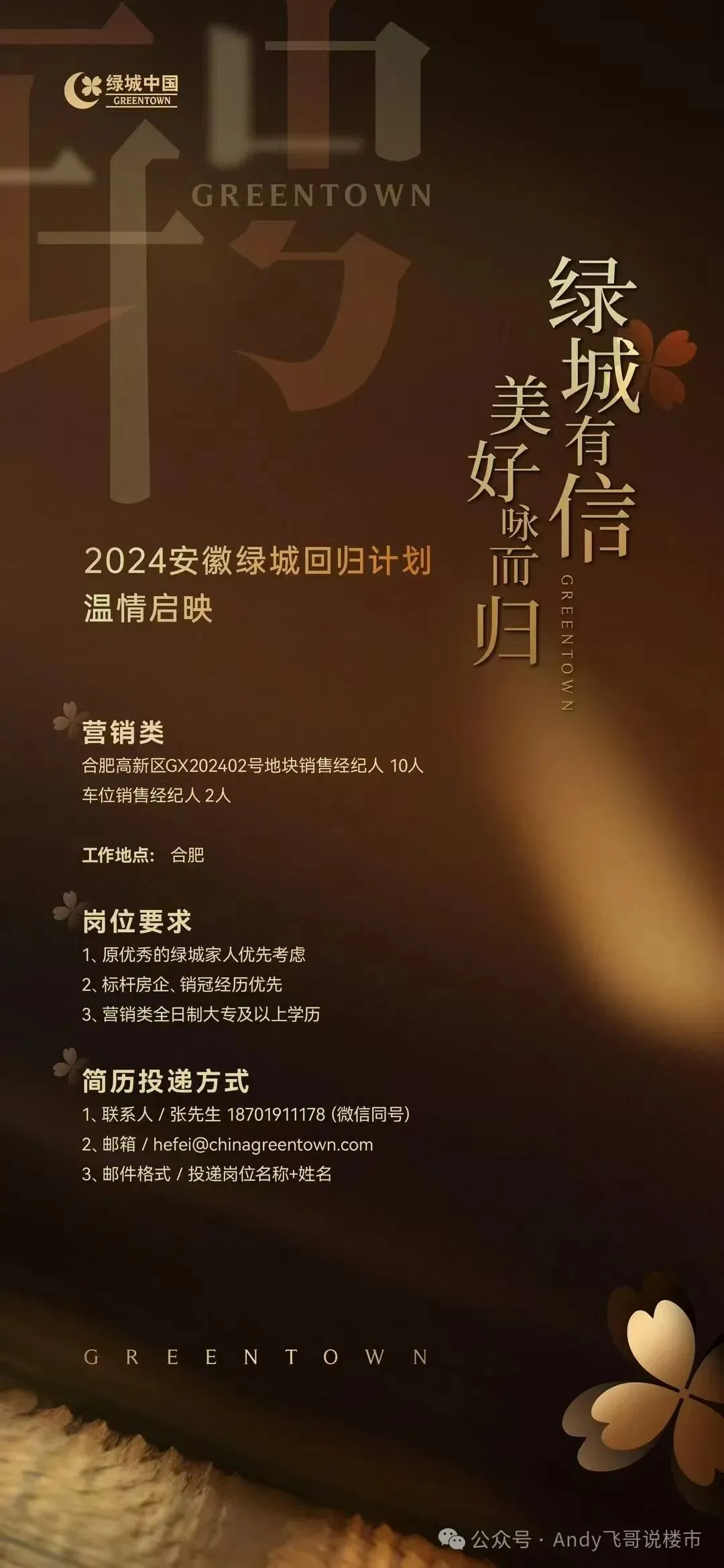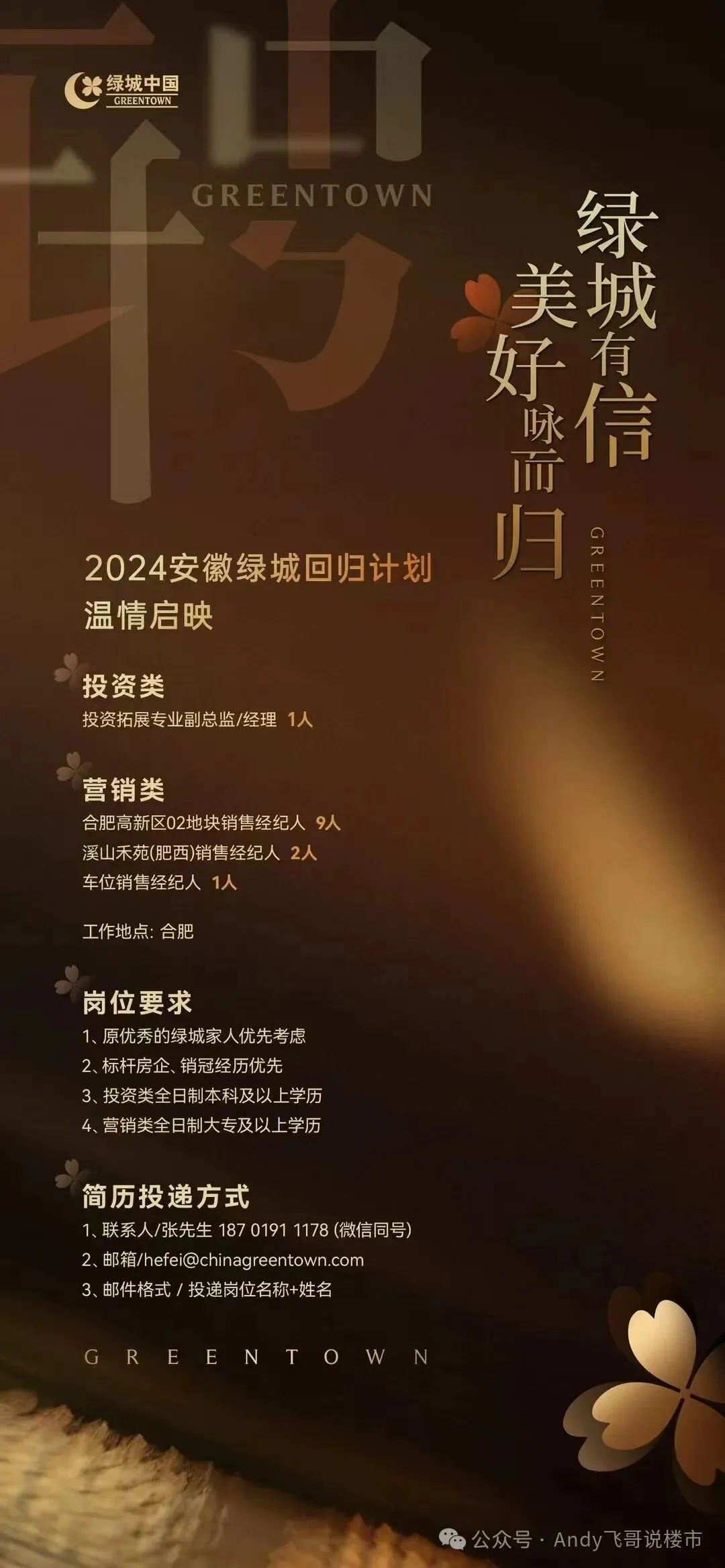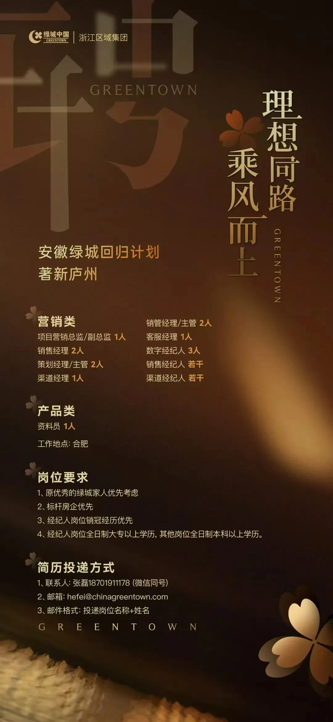 简历投递:zhanglei0905@chinagreentown.com,简历请注明应聘[绿城合肥咏溪雲庐]