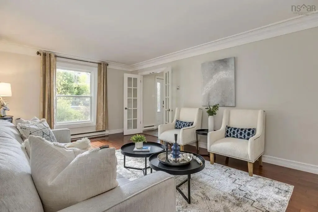 室内,主层布局简洁流畅,空间安排非常合理,包括明亮通透有壁炉的的客厅,空间独立设施齐全的用餐厨房,采光充足的两间卧室(其中主卧现在用于会客厅),一间洗衣房以及一间全浴室。