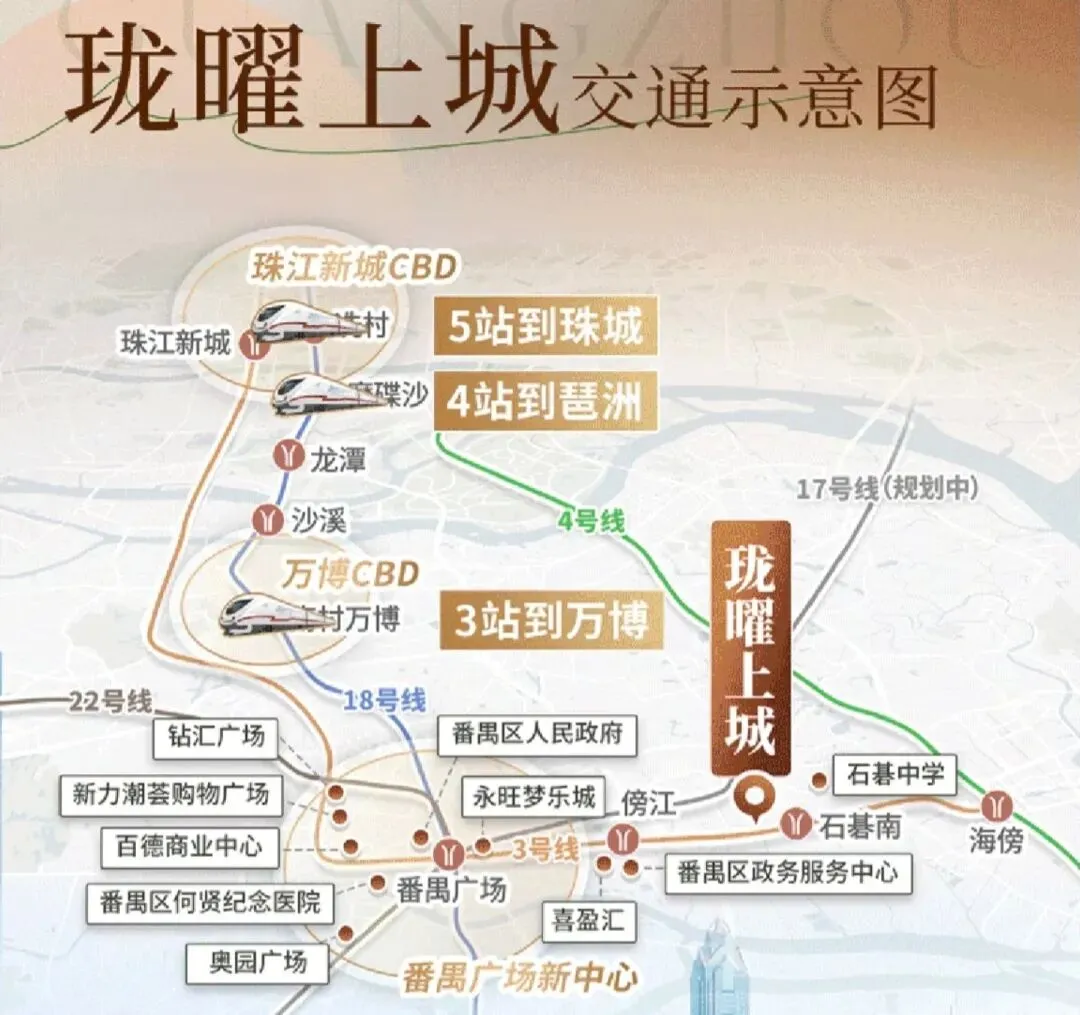 地铁:距地铁3号线东延段石碁南站约500米,步行8-10分钟可达。通过3号线无需换乘,3站直达万博CBD、5站抵达珠江新城,无缝接驳18号线、22号线,半小时内畅达珠金琶核心生活圈。