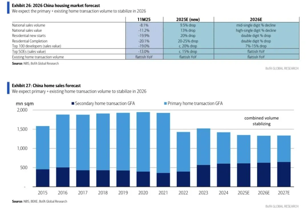 我们认为新房和二手房合计成交量应在2026年趋于稳定(尤其是在头部城市)。对于新房销售,我们认为当前的运行速率已低于内在需求,其缺口可由延迟的改善性需求、保障性住房供应以及空置房源的竞争来解释。我们预计这些因素在2026年不会进一步恶化。对于二手房市场,大部分需求来自瞄准小面积、低总价单位的首次购房者。我们预计这类需求在2026年将保持相对稳定,而北京、上海和深圳任何实质性的购房限制放松都可能成为上行催化剂(一线城市的二手房成交量约占全国总量的10%)。