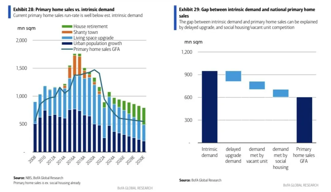 一手房销量已低于内在需求:若排除保障性住房/安置房,我们估计2025年全国一手房销售面积可能已降至约6亿平方米,相当于约600万套商品住房销售。我们认为,这一水平远低于我们估算的约9亿平方米的内在需求,而这一差距无法由以下因素完全解释: