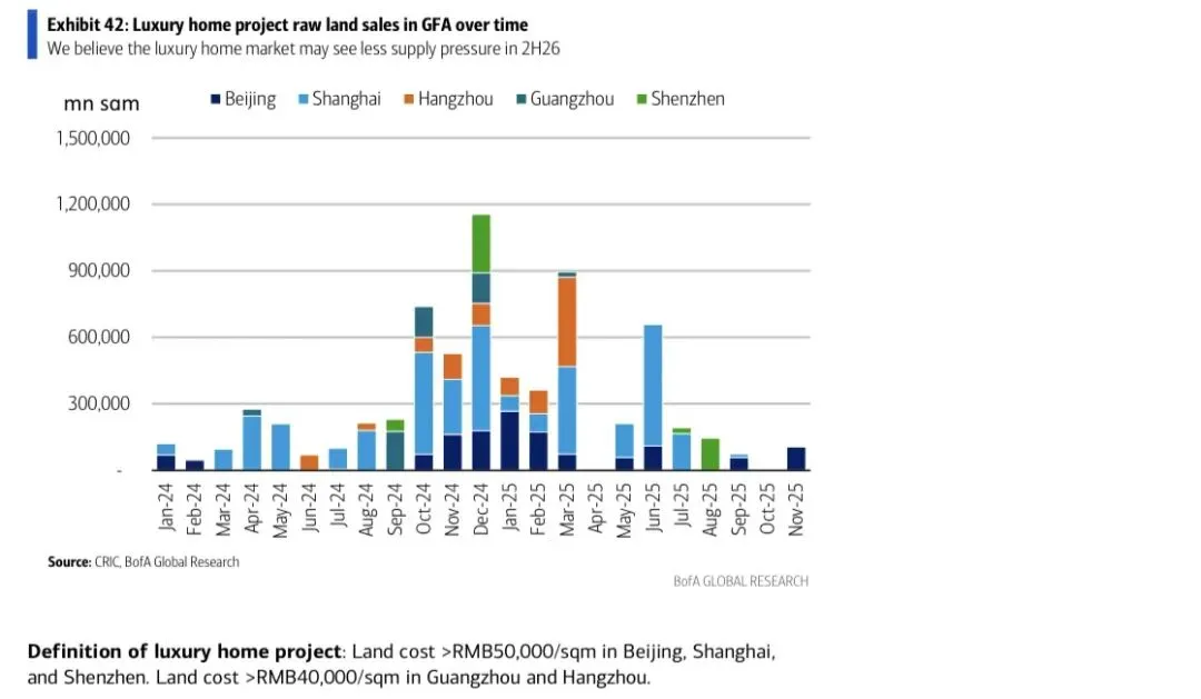 近几个月来,随着供应量的增加,豪华住宅市场已出现降温。然而,根据我们对豪华住宅项目供应管线的核查,我们认为该市场在2026年下半年可能面临较小的供应压力(假设从土地收购到豪宅项目开盘之间存在6至15个月的时间差)。豪宅定义:北京、上海及深圳土地成本大于5万元/㎡的项目,广州和杭州土地成本大于4万元/㎡的项目。