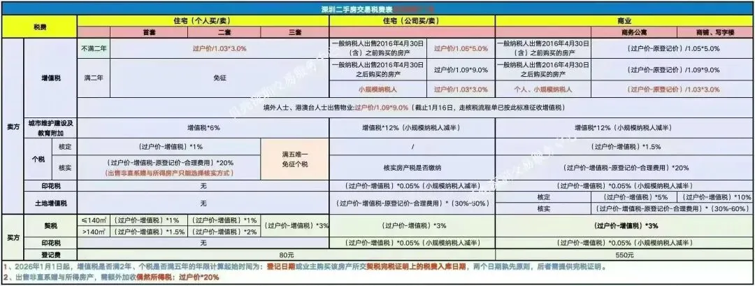 2026年1月20日深圳税务局重新调整了深圳二手的交易税费,其中令人关注的有两点。第一点:就是对2025年12月30日财政部发布个人销售住房增值税政策的一个明细补充;“财联社12月30日电,财政部发布关于个人销售住房增值税政策的公告。个人(不含个体工商户中的一般纳税人,下同)将购买不足2年的住房对外销售的,按照3%的征收率全额缴纳增值税;个人将购买2年以上(含2年)的住房对外销售的,免征增值税。 本公告从2026年1月1日执行!”这条政策其实就是对不满2年需要交易的房产的进行一个减税,但这政策有几点没讲清楚- 之前我们去国土局缴税的时候,我们看该房子(产权:住宅)购买的时间是否满2年和是否5年是看购买该房产是的网签时间而不是看该房产的办证时间或购入该房产所交契税完税证明上的税费入库时间。这其中差别是很大,一般来讲对于购买新房,网签时间和交完契税办理房产证的时间将相差到1年多,而一般购买二手房在网签时间和二手交易完成契税证明并取得房产证之间最快也要10天左右的时间,所以这对核算的时间有很大的不同,这次明确规定核实一套房子购入是否满2年是看该房子办理房产证的时间或购入该房产所交契税完税证明上的税费入库时间。这对于那些23年买入新房的而24年办理房产证的业主来讲就多增加了一个3%增值税。