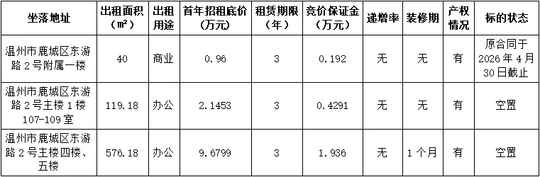 现委托温州联合产权交易中心有限公司,通过“浙交汇”平台对以下标的租赁权进行“网络竞价”式交易,于2026年1月29日上午10时开始自由竞价,2026年1月29日上午11时整开始限时竞价,具体事宜详见“浙交汇”网站项目信息披露。