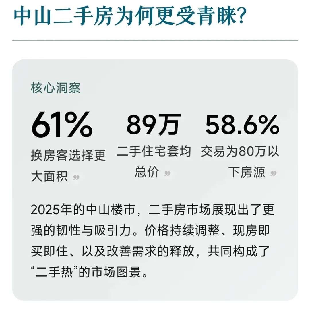 2025年中山二手房更受青睐,核心是性价比、即住性、配套成熟度、政策与供应结构叠加,形成对新房的明显分流;市场呈现量稳价跌、区域分化、刚需主导、流通性提升四大特点,且二手成交占比首次超过新房,成为市场主力。