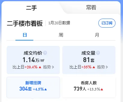 整体来看,当日二手房市场呈现“量价齐升”格局,价格涨幅尤为明显,配合挂牌量与看房人数同步增长,表明市场信心有所回暖,短期交易活跃度较高。后续需关注该趋势是否具备持续性。