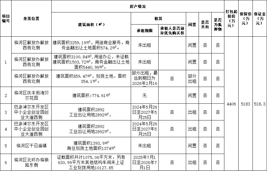 >房产、土地丨内蒙古巴彦淖尔市临河区6宗资产打包转让项目