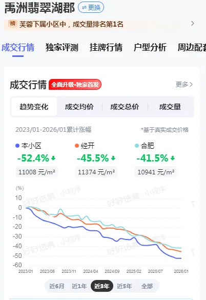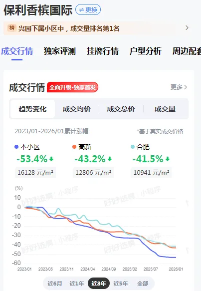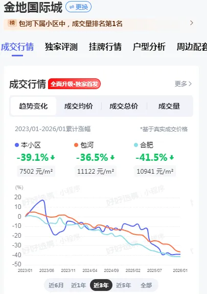 金地国际城作为包河区成交量排名第一的小区,三年累计跌幅为39.1%,虽然也经历了显著下跌,但相对于政务、滨湖的标杆楼盘,表现出更强的抗跌性。这一现象反映出当前市场环境下,购房者的偏好正从追求增值转向注重实用性和性价比。
