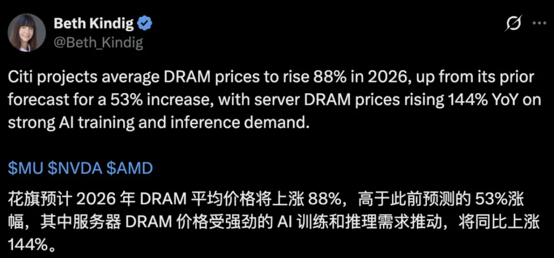 花旗银行的最新研报发出预警:2026年DRAM(动态随机存取存储器)平均售价同比或将上涨88%!
