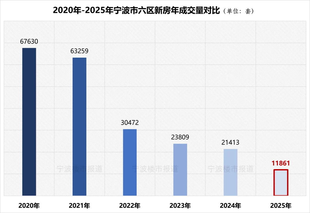 2025年,宁波市六区新建商品住宅(以下简称“新房”)成交量再创本轮深度调整以来的新低,全年仅共成交11861套,只比2024年的一半略多一点,不足2020年的18%。