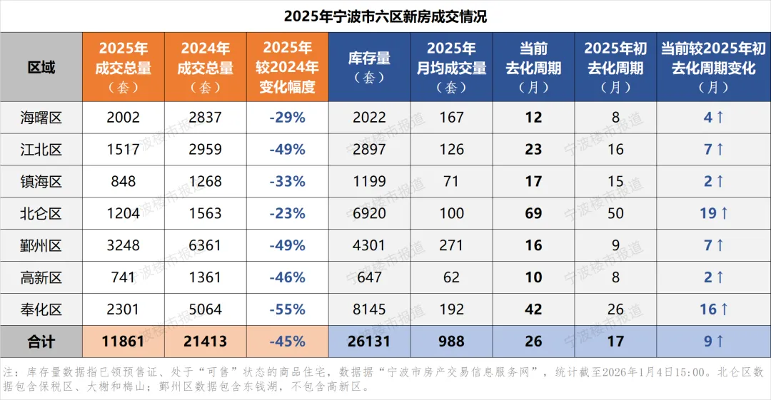 从市六区2025年各自月均二手房成交量以及总挂牌量数据,来推算各自静态消化周期,鄞州区、海曙区、江北区都要消化两年半以上。