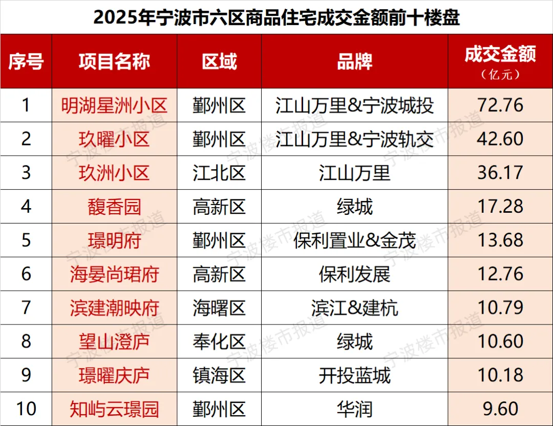 但在低成交量中,一批高端改善盘表现却极其亮眼——尤其是江山万里的玖洲(江北湾头)、玖曜(鄞州钱湖商圈)、明湖星洲(东部新城明湖),占据了全年市六区新房成交面积、成交金额前十榜单的前三名。