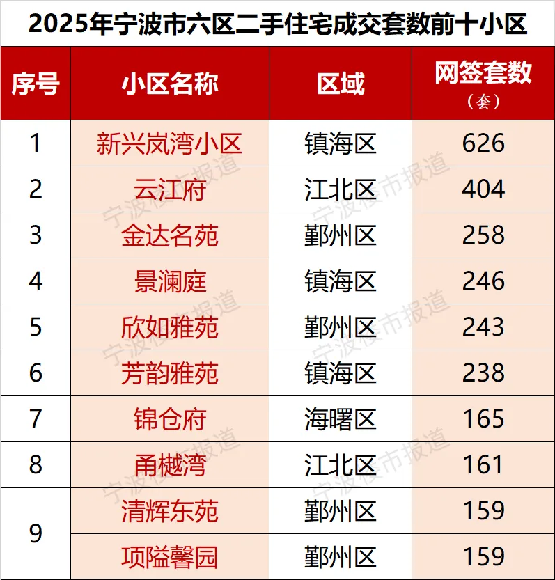 2025年市六区中最“吃香”的二手房小区,和前两年一样,依旧是低总价的次新安置房小区,它们在成交套数前十榜单中占了9个。其中,鄞州、镇海各占了4个和3个,前者分布在下应、首南、五乡和东部新城;后者则集中在骆驼和蛟川。