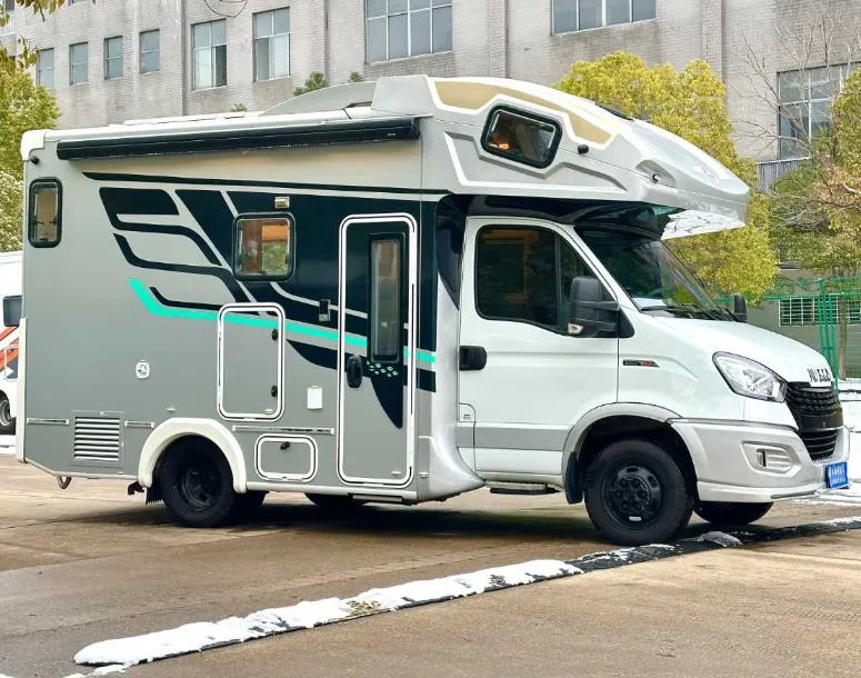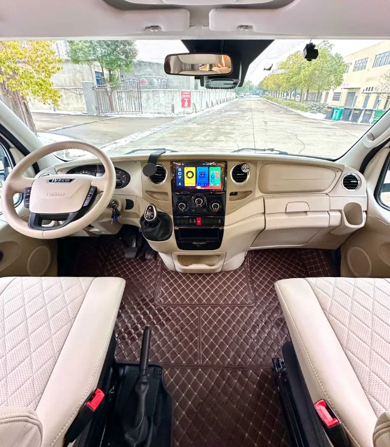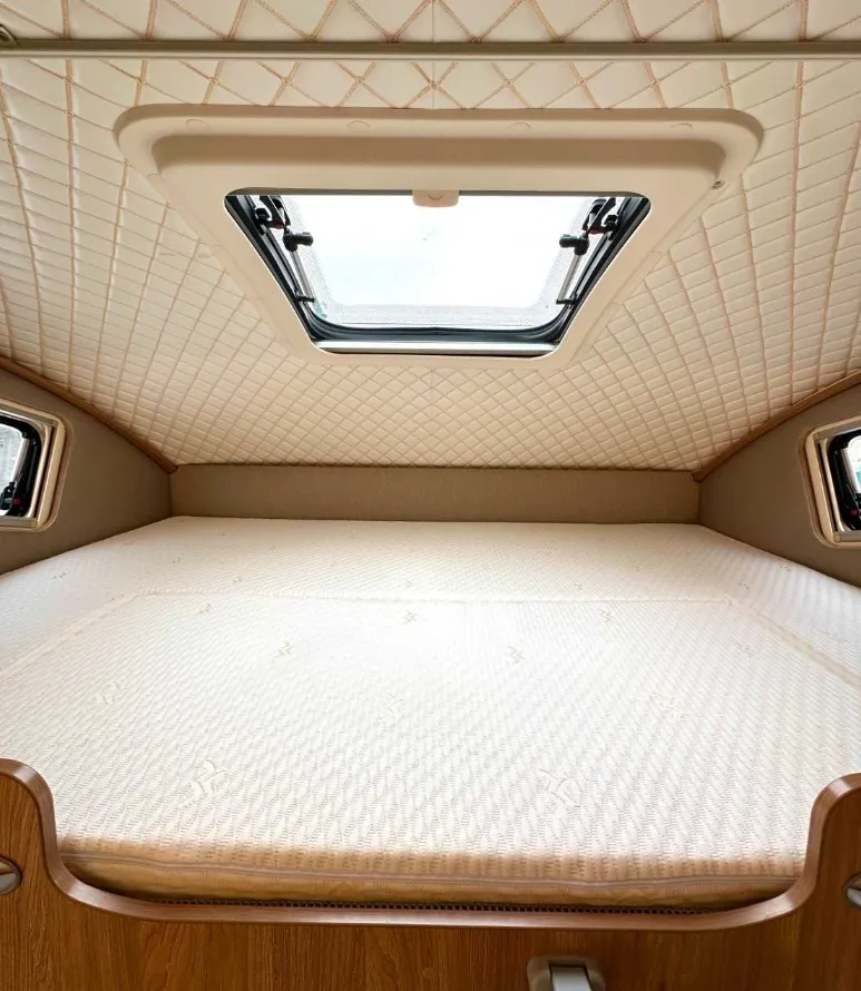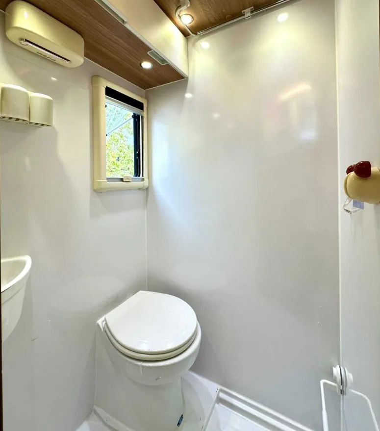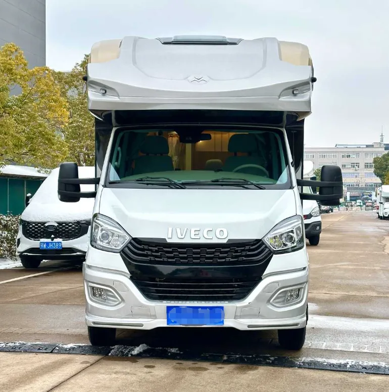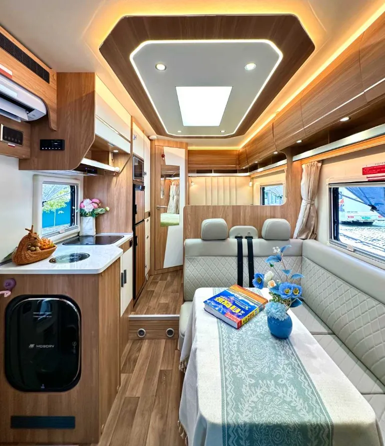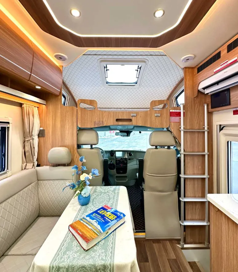 【上装配件】车载电视、音响系统、四路监控、家用空调、滚筒洗衣机、独立衣柜、燃油暖风热水、五孔插座。抽油烟机、电磁炉、洗菜池、微波炉、双开门冰箱、五孔插座。卫生间有直排马桶、面盆、淋浴花洒、梳妆镜、毛巾架、双向换气扇、暖风出风口。遮阳棚、电动踏步、抽拉柴油灶、加水口、取水口、充电口、取电口、三口杠。