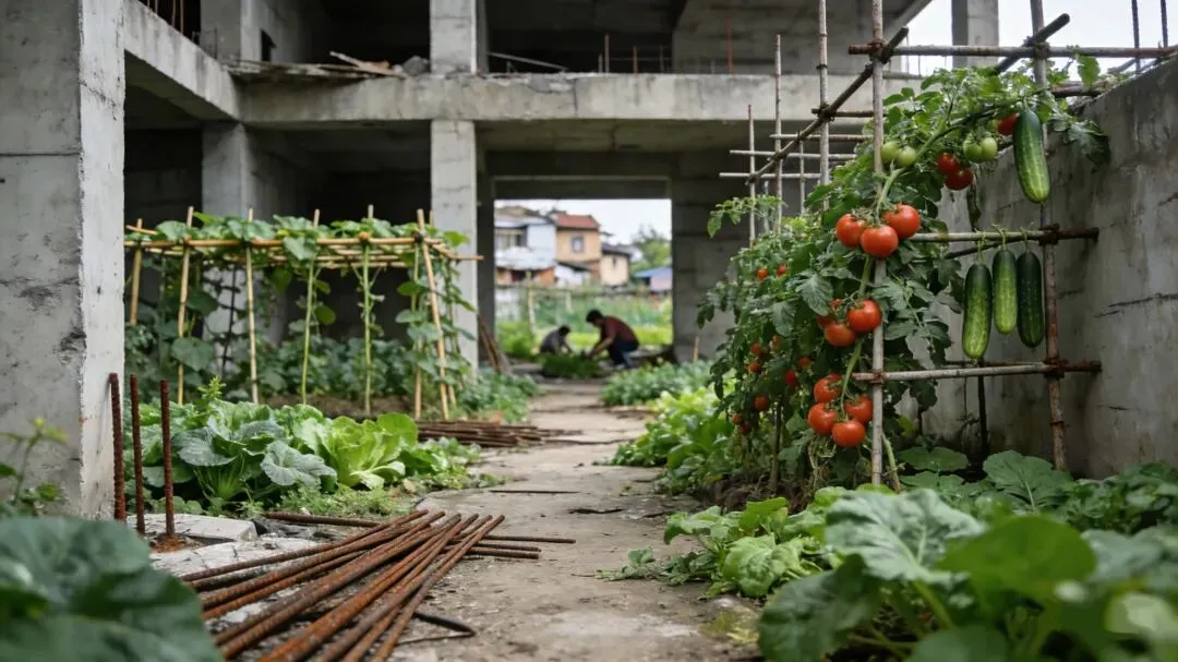 塔吊锈迹斑斑地矗立在荒草间,裸露的钢筋被藤蔓缠绕,曾经热火朝天的施工工地,如今被划分成一块块菜园,