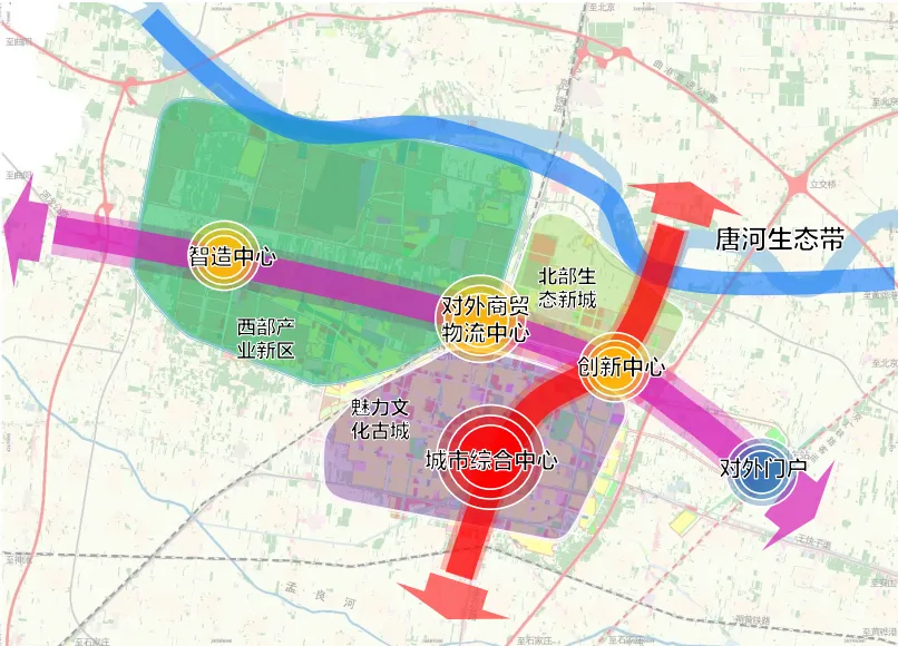 在千年历史文化的滋养下,定州市打造历史文化名城取得不错成果,定州博物馆、宋街、众春园等文旅项目成为城市的闪亮名片。同时,近年来定州市坚持建设现代化高品质中等城市的目标,大力引进战略新兴产业、现代物流产业等,建设京津冀先进制造基地、科技成果转化基地和现代商贸物流基地。以产城融合、人文兴城、蓝绿润城为发展战略,统筹城乡发展。在此基础上,定州主城区以“建设新城、保护古城、提升旧城”为布局原则,优化形成““一主一副、一核四心”的中心城区空间结构。