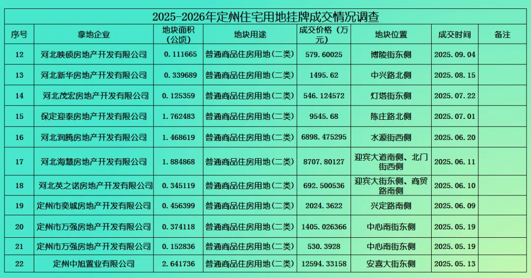 (定州市主城区2025-2026年1月住宅用地成交情况统计)