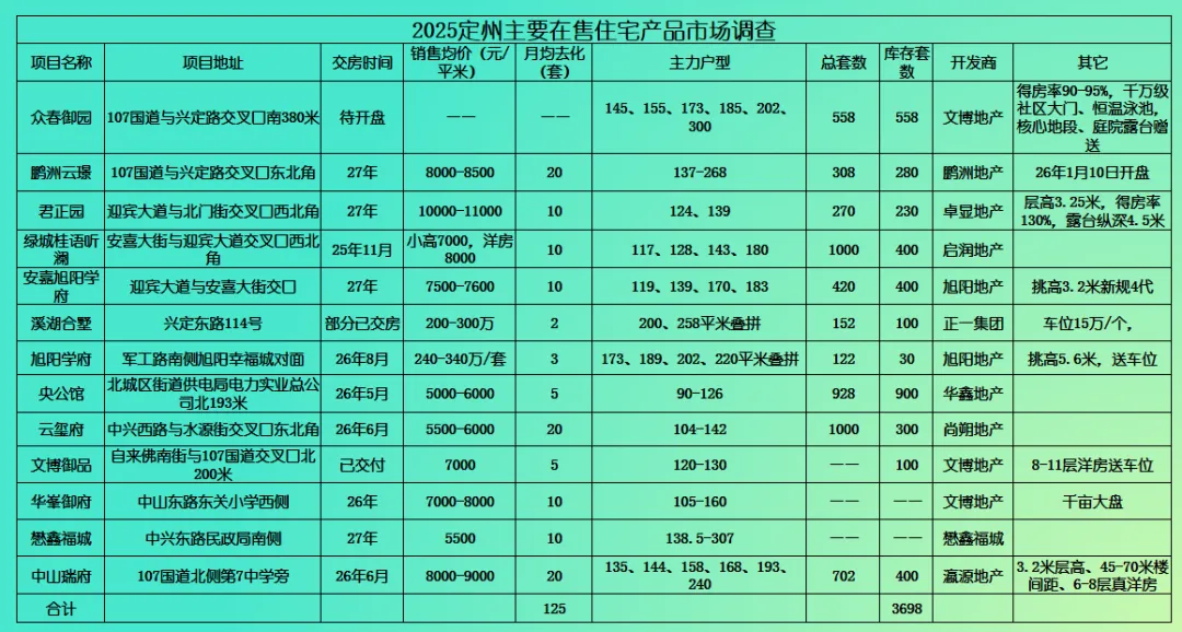 大量土地成交对住宅市场的直接影响,便是市场上存有大量的在售项目。定州住宅市场多年来由多家本地开发商文博地产、香江地产、鹏洲地产、中天地产、启润地产等为主导,各开发商百花争鸣。根据我们的不完全统计,目前定州主城区有数十个在售项目,联排叠拼、改善洋房、刚需高层等不同层次的产品都有比较充足的供应量,使定州楼市无论在那个层面都形成了一种十分“卷”的局面。