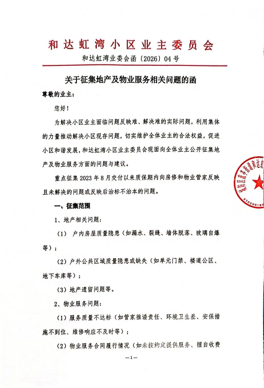 为解决小区业主面临问题反映难、解决难的实际问题,利用集体的力量推动解决小区现存问题,切实维护全体业主的合法权益,促进小区和谐发展,和达虹湾小区业主委员会现面向全体业主公开征集地产及物业服务方面的问题与建议。