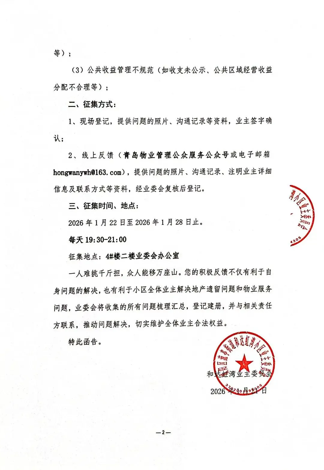 2、线上反馈(青岛物业管理公众服务公众号或电子邮箱hongwanywh@163.com),提供问题的照片、沟通记录、注明业主详细信息及联系方式等资料,经业委会复核后登记。