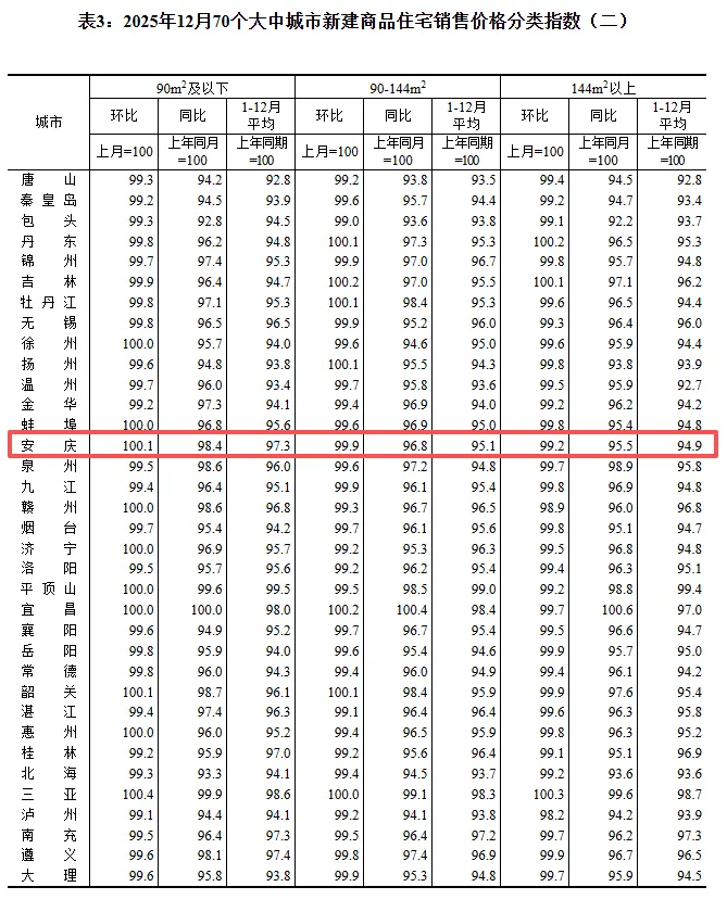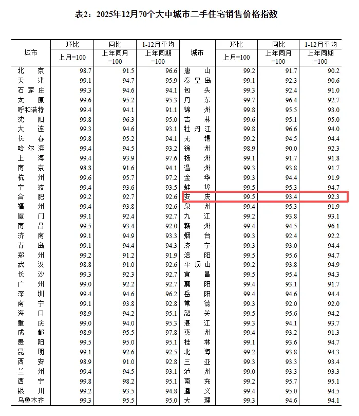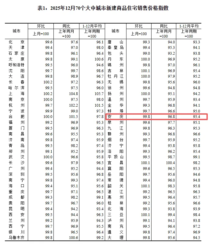 1月19日,国家统计局发布了《2025年12月份70个大中城市商品住宅销售价格变动情况》,其中,安庆市新建商品住宅销售价格环比下降0.2%,二手住宅销售价格环比下降0.5%。