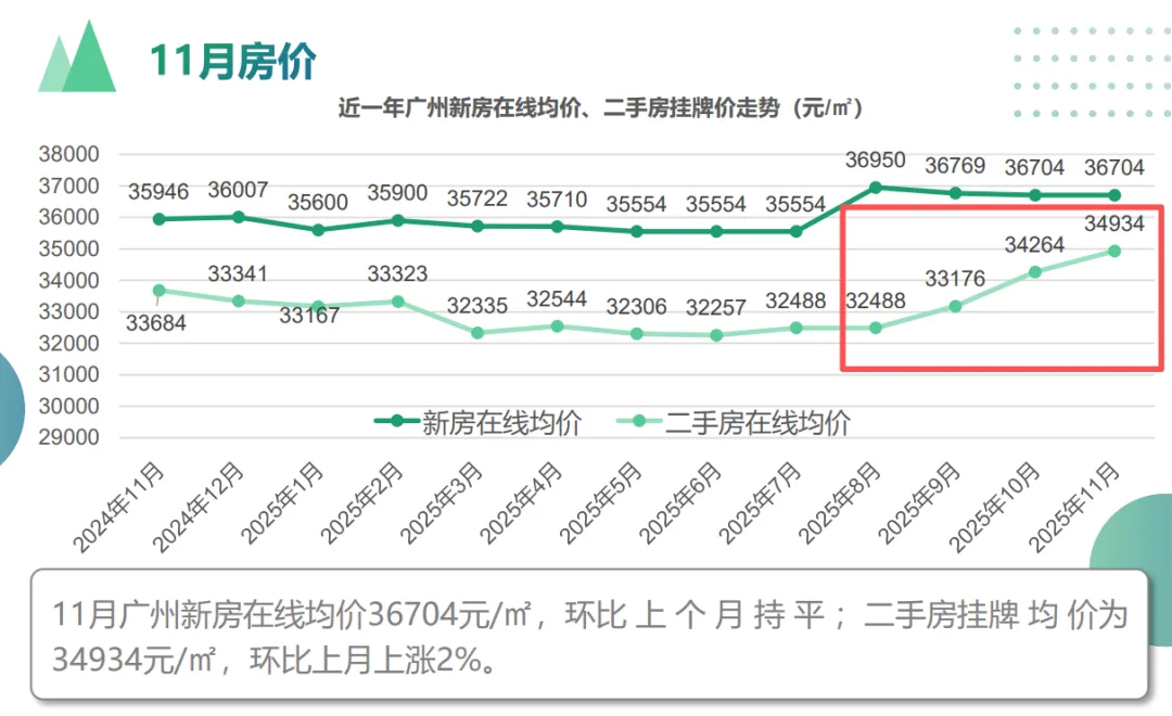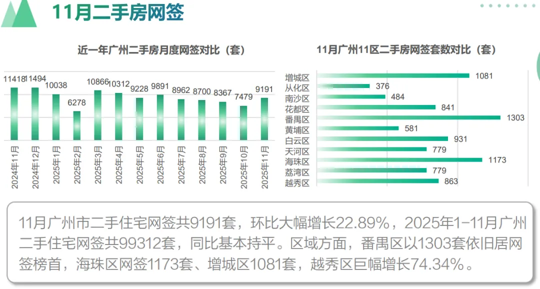 11月广州二手房成交量环比大涨23%!二手房价已连涨4个月!量价齐升的爽文主角,终于轮到二手房,来看看哪些区域/楼盘最抗跌!广州二手房量价齐升数据显示,2025年11月广州二手住宅网签9191套、91.47万平方米,环比分别大幅增长22.89%和23.07%。市场活跃度明显回暖,越秀区更是以74.34%的环比增幅一骑绝尘!除了成交量,广州市二手房挂牌均价也已经悄悄连涨4个月。二手房终于迎来了量价齐升!临近年末,二手房量价齐升,为了给大家买卖二手房提供更加具体的数据,小安再次整理了最新的二手小区涨跌幅榜,有了新发现!如榜首的老黄埔板块港湾三村涨幅高达24.65%,近5号线大沙地地铁站,据珠江村旧改、裕丰围旧改都很近。除此之外,别墅及优质地段小区同样表现突出,如珠江别墅、华侨新村别墅等,显示高购买力客群对稀缺资产的追逐。高端改善依然不容小觑,这个趋势与新房销售趋势一致。广州二手房跌幅超15%的小区则有46个,重灾区集中在外围区域,而且商住公寓、远郊大盘和配套滞后的社区跌幅显著。总的来说,“地段+品质”仍是硬通货,中心区优质物业抗跌性强;非住宅类、远郊盘风险高,去化压力大。综合广州最新二手房成交与价格的数据,小安对2026年广州二手房市场预测有以下几点变化:1、成交量有望温和回升。政策环境稳定(官方会议继续强调“稳楼市”)、房贷利率低位运行,支撑刚需和改善需求逐步释放。2、价格仍将结构性调整。核心区域企稳,部分甚至小幅回升;外围区域仍有回调压力,直至价格与价值匹配。3、产品分化加剧。好地段、好户型、好物业的“三好楼盘”将更受青睐;老旧小区、远郊盘、非住宅类产品仍面临挑战。4、建议买家:自住可关注中心区性价比房源,择机入场;投资需谨慎,避免高杠杆追逐远郊概念盘。