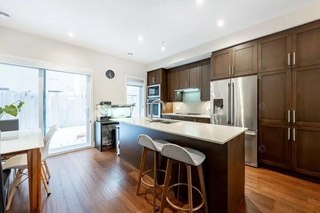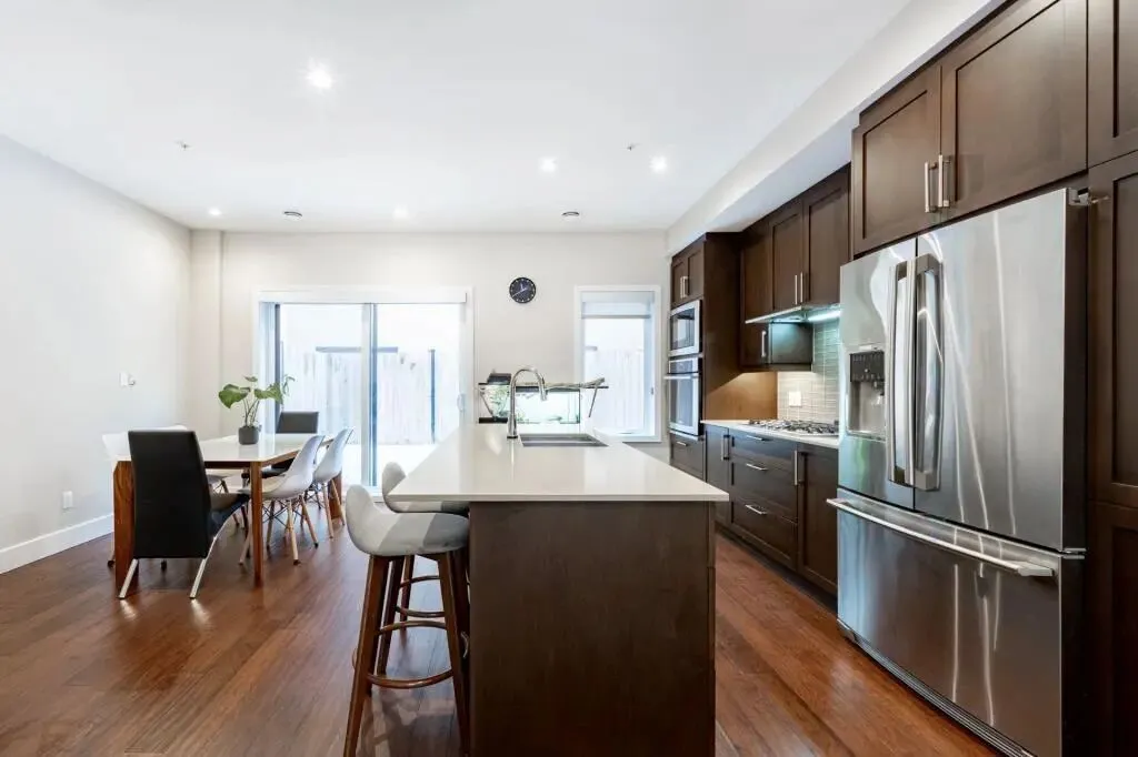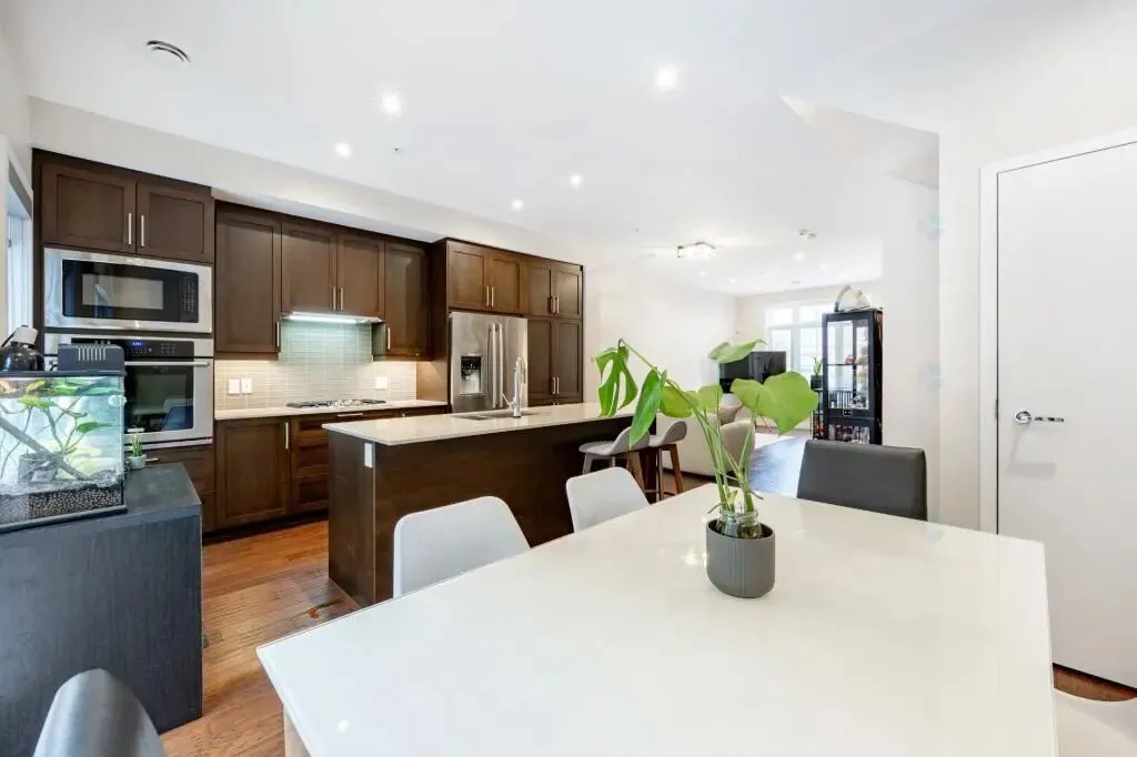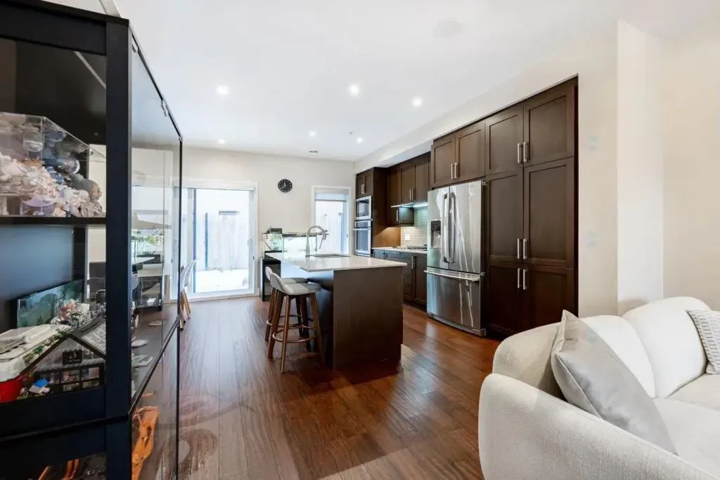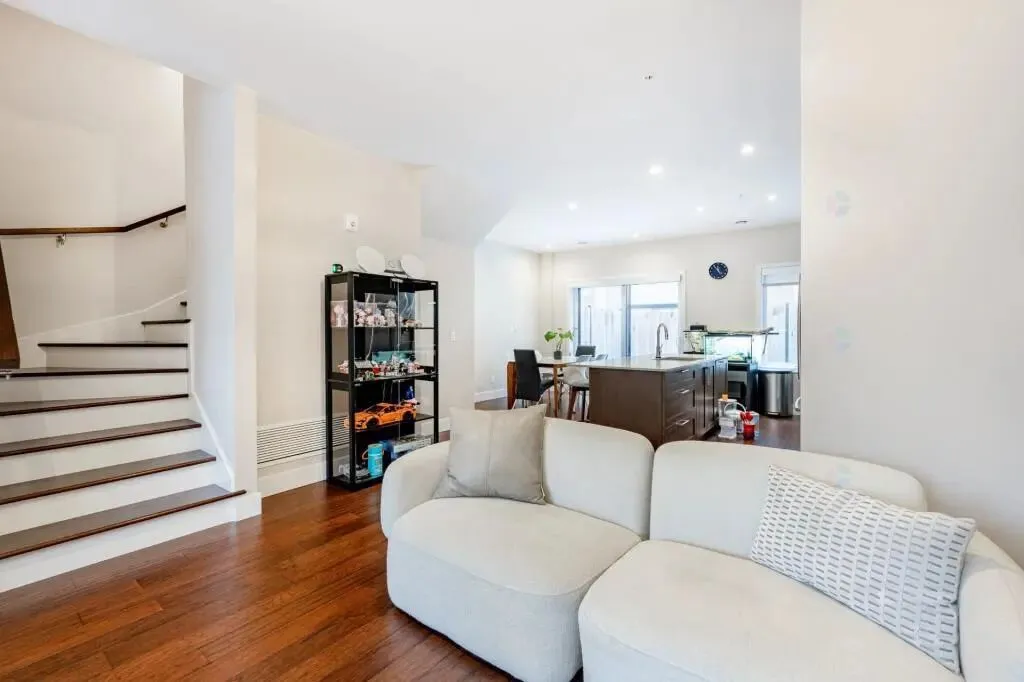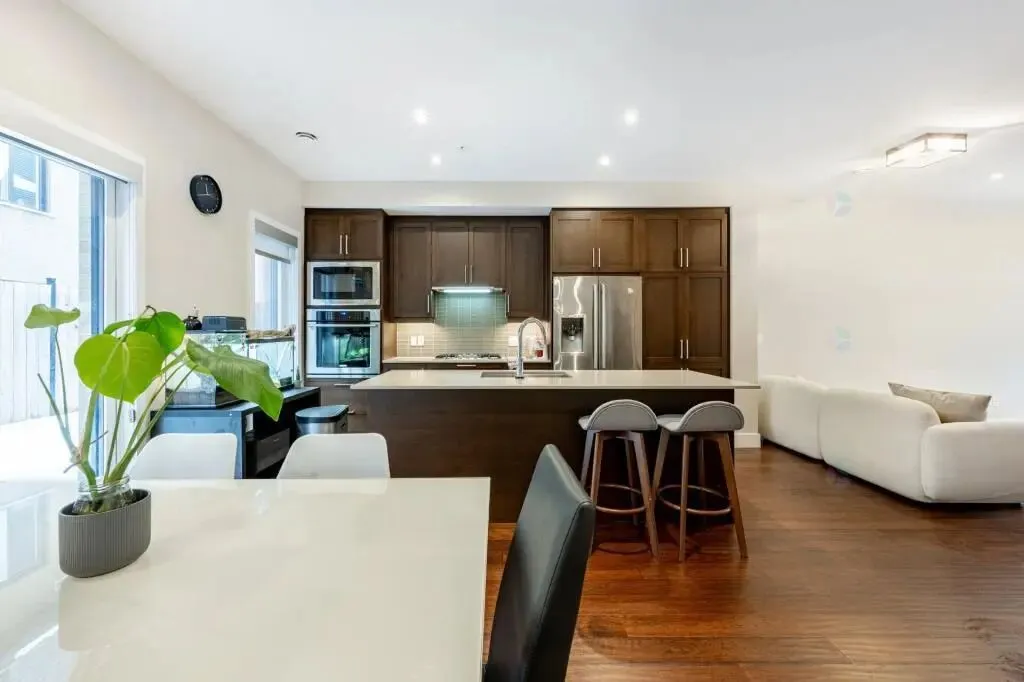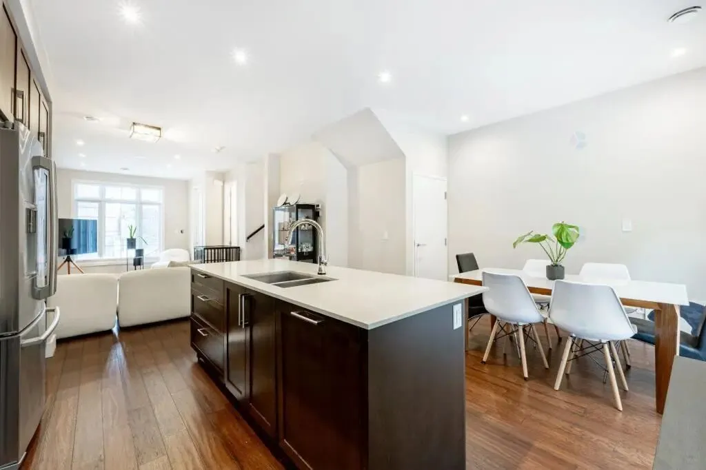 此住宅的设计完美契合现代舒适与灵活的生活理念。主层采用开放式格局,客厅、餐厅与厨房融为一体,视野开阔通透。大幅窗户确保全屋阳光充沛,采光极佳。厨房配套齐全,布局高效,与用餐区无缝衔接,便于备餐与家庭互动。