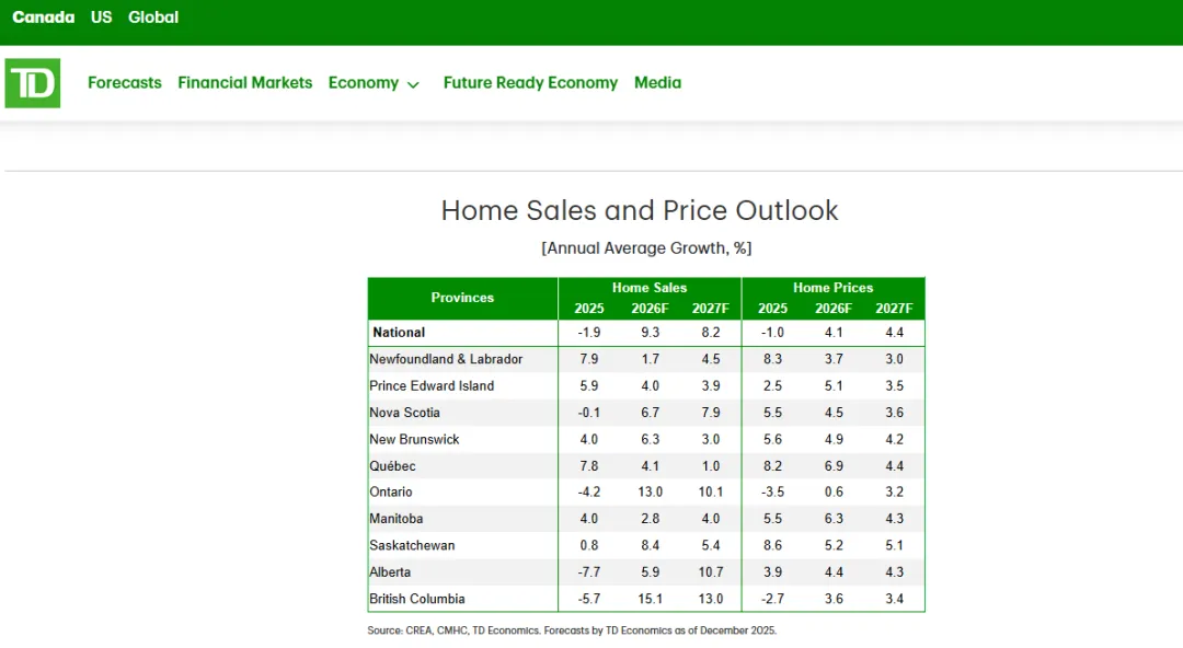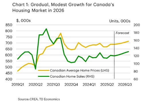 TD 预计,随着利率企稳、购房信心略有改善,阿尔伯塔省二手房成交量在 2026 年将比 2025 年略有增长。