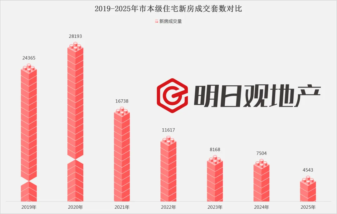 2025年,市本级住宅新房成交备案共计4543套,同比2024年下降39.46%,较历史高点2020年下降83.89%,全年成交量再探底。