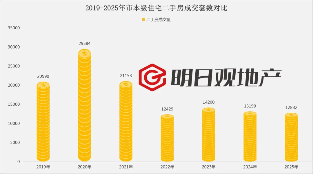 2025年,市本级住宅二手房成交备案共计12832套,同比2024年仅小幅下调2.78%。