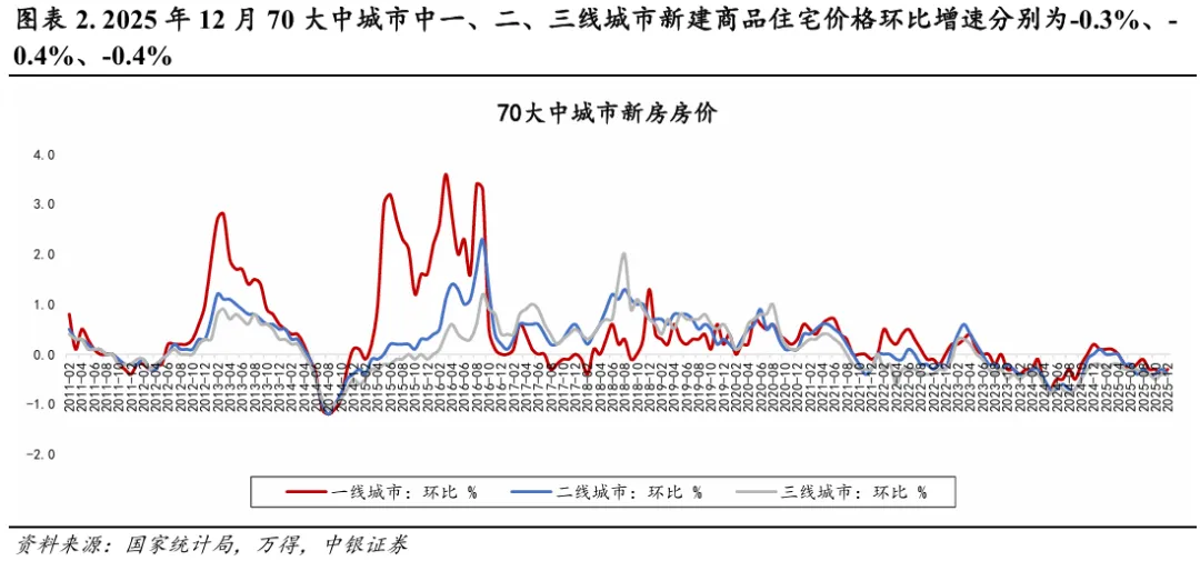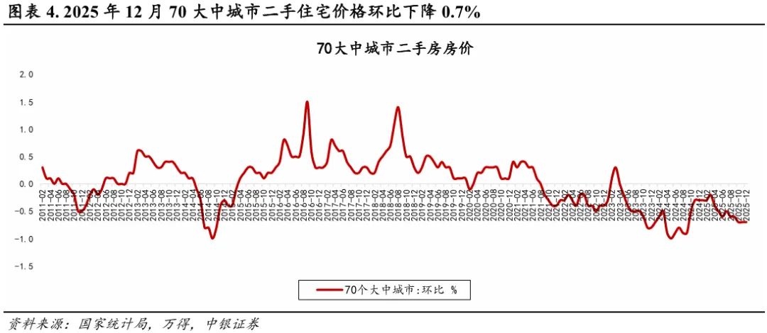 国家统计局发布2025年12月份70个大中城市商品住宅销售价格变动情况。70大中城市新房价格环比下降0.4%;二手房价格环比下降0.7%。