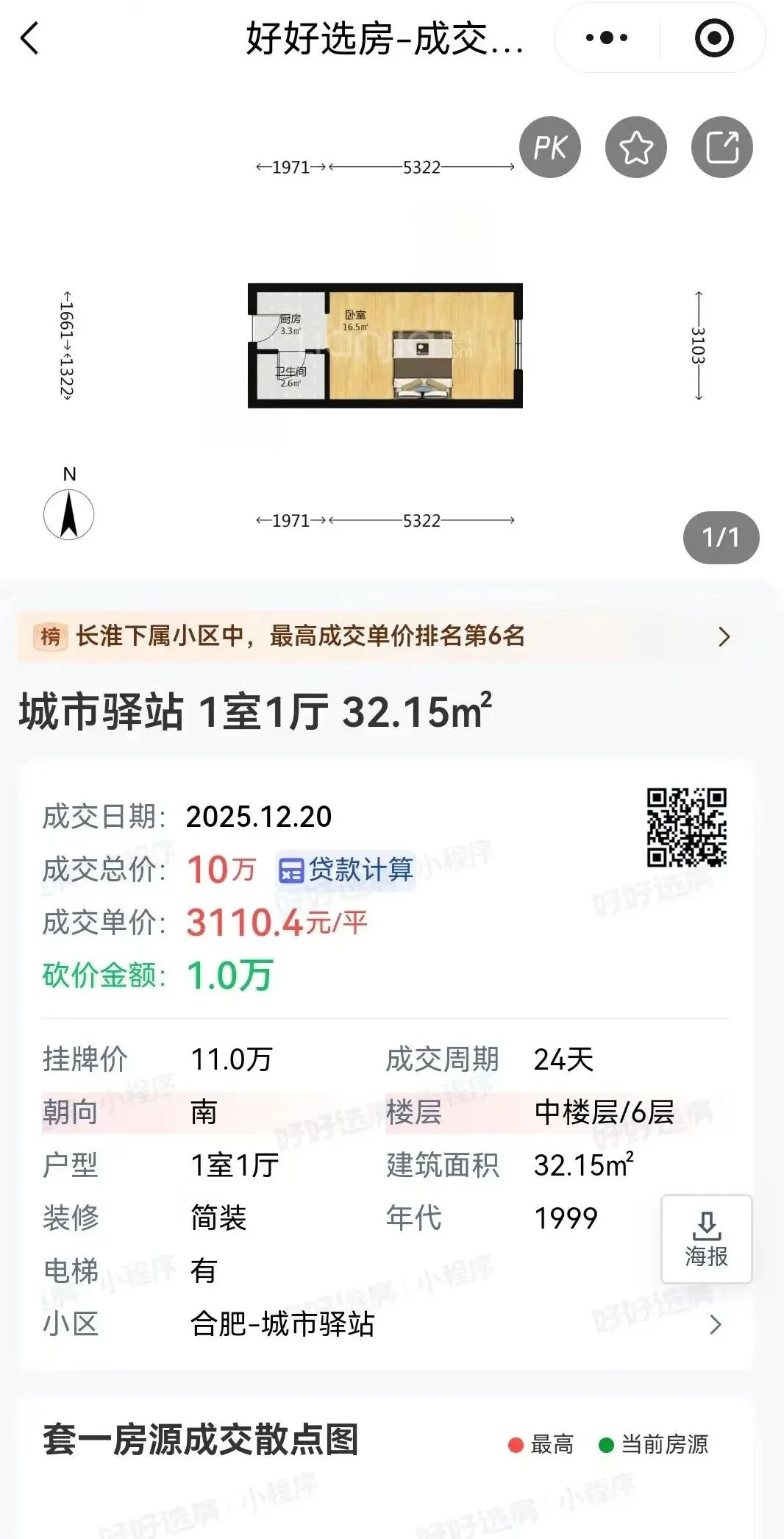 1、瑶海城市驿站:一套32.15㎡房源以总价10万元成交,单价仅3110.4元/㎡。