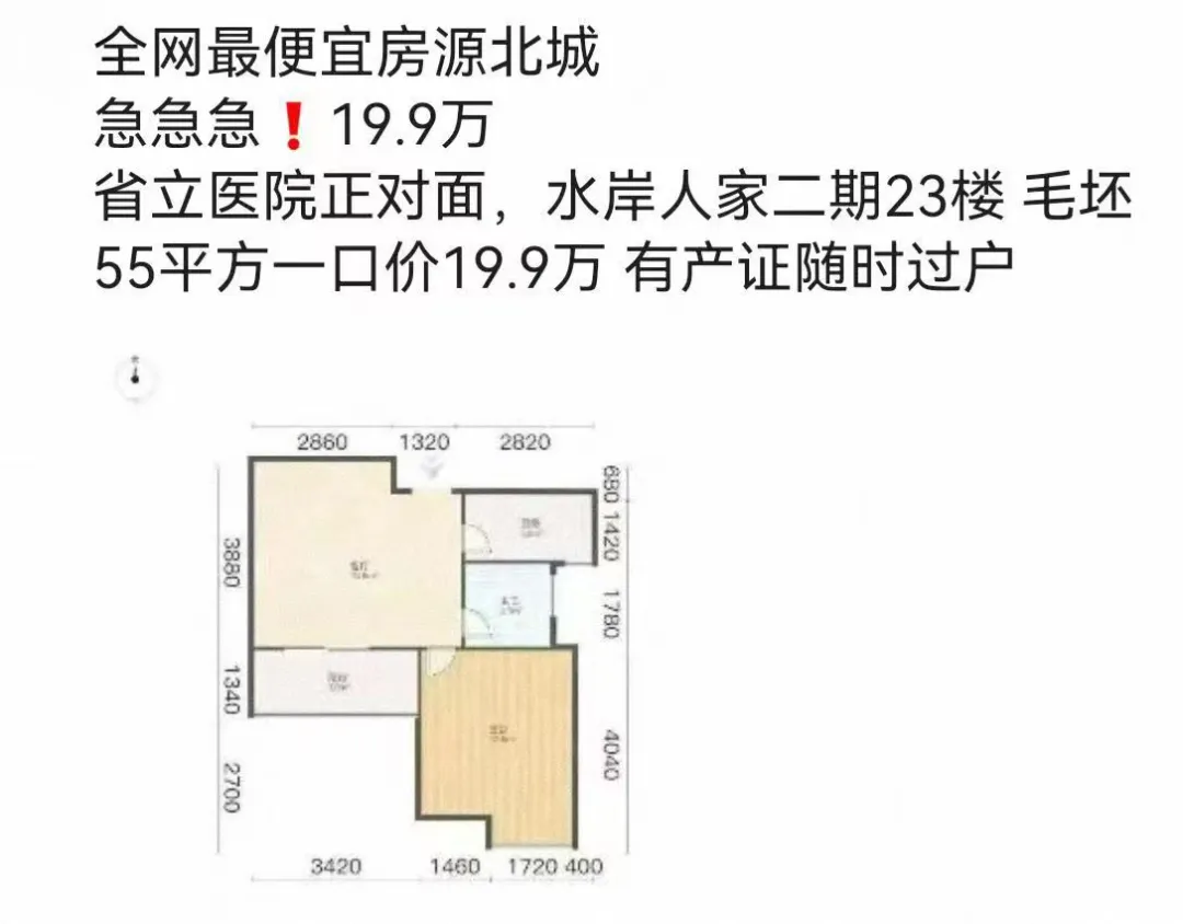 3、北城省立医院正对面的水岸人家:二期23楼,毛坯55㎡,一口价19.9万,有产证随时过户,折合成单价3545.4元/㎡。