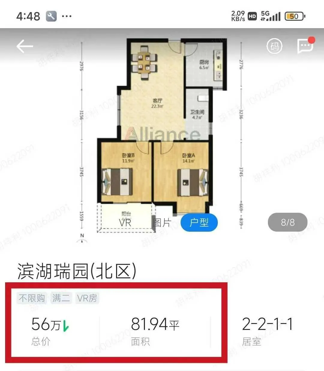 4、滨湖康园(北区):一套81.94㎡的两室,总价56万,折合成单价仅6834元/㎡。