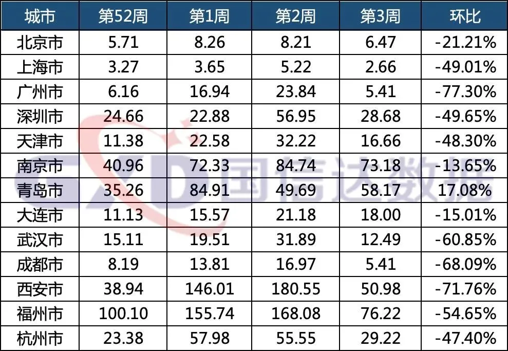 13个重点城市中近一个月挂牌量周指数情况如下