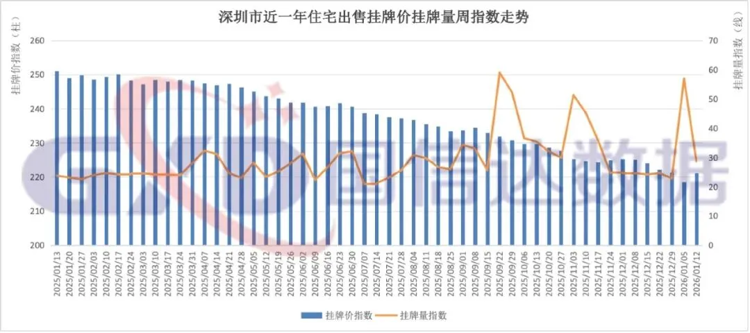 13个重点城市中近一年挂牌价、挂牌量周指数走势如下图:
