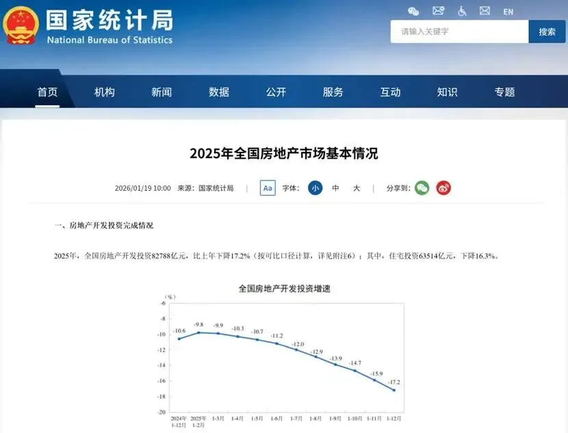 国家统计局发布的最新数据显示,2025年全国房地产开发投资比上年下降17.2%。
