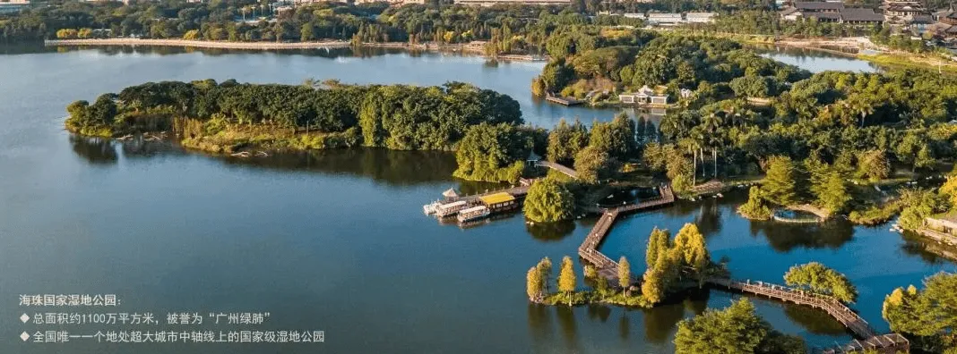 项目南瞰超万亩海珠国家湿地公园,该公园是全国唯一超大城市中轴线上的国家级湿地公园,被誉为 “广州绿肺”,为居民提供了优美的自然景观和清新的空气。