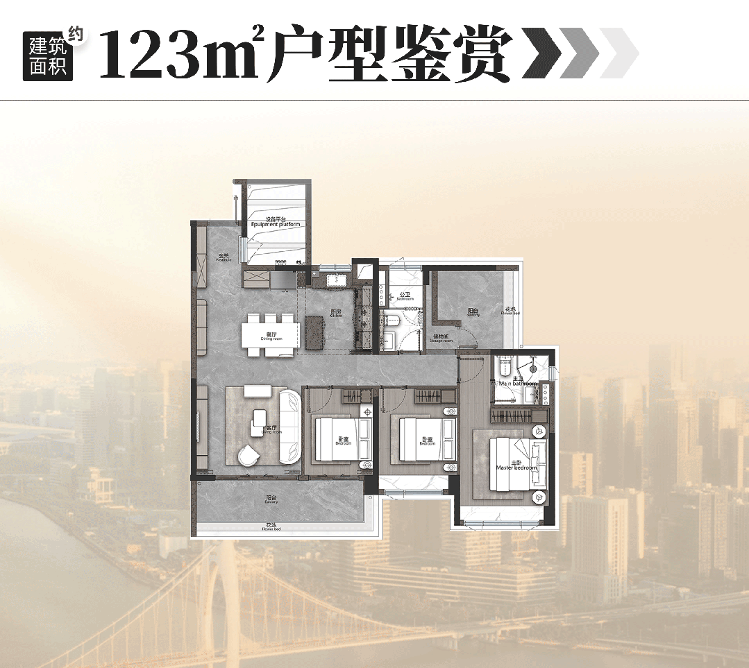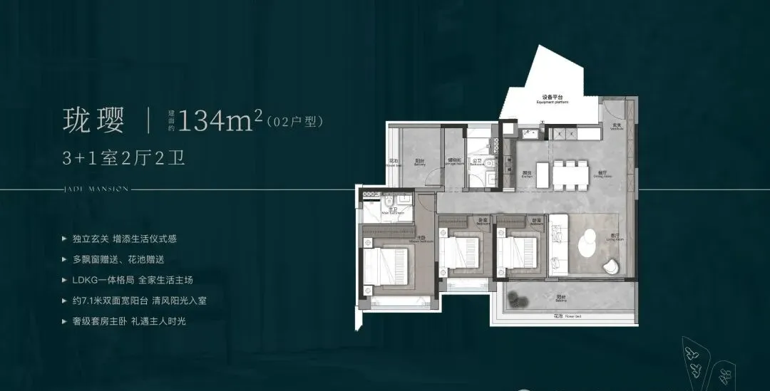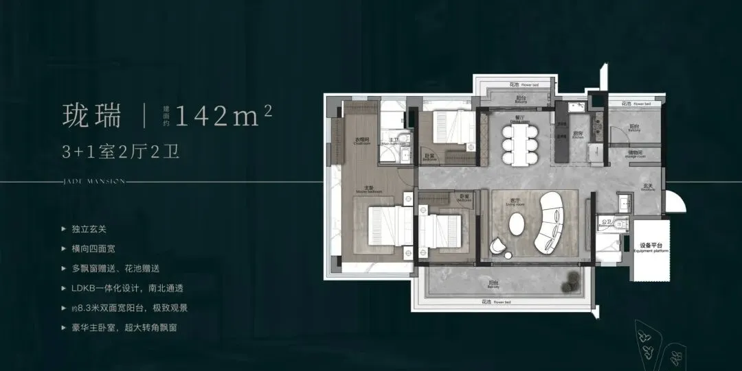 如设备空间、厅卧都可做灵活空间,相当于在三房基础上,再多两个多功能室,这是同面积段户型无法匹及的格局。