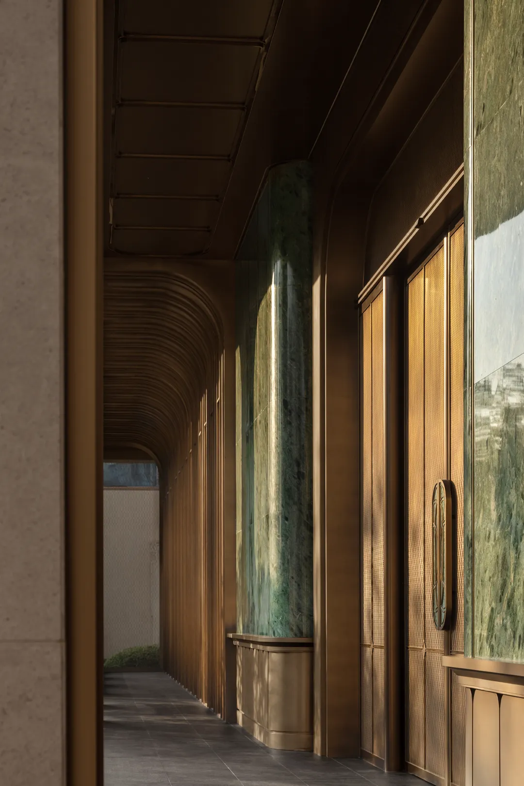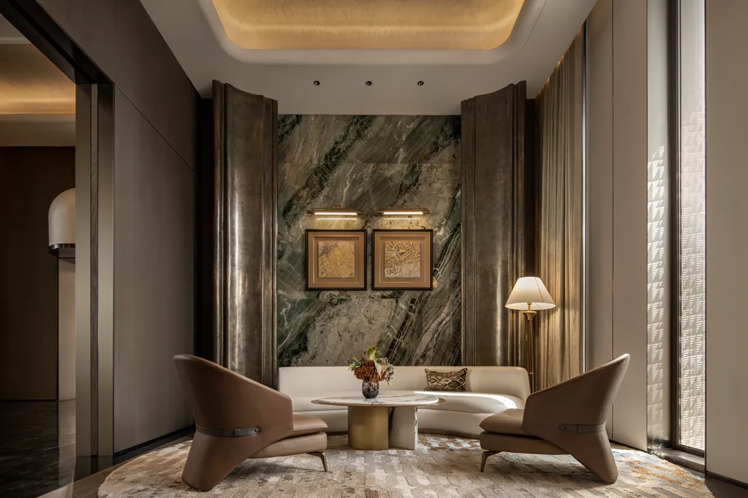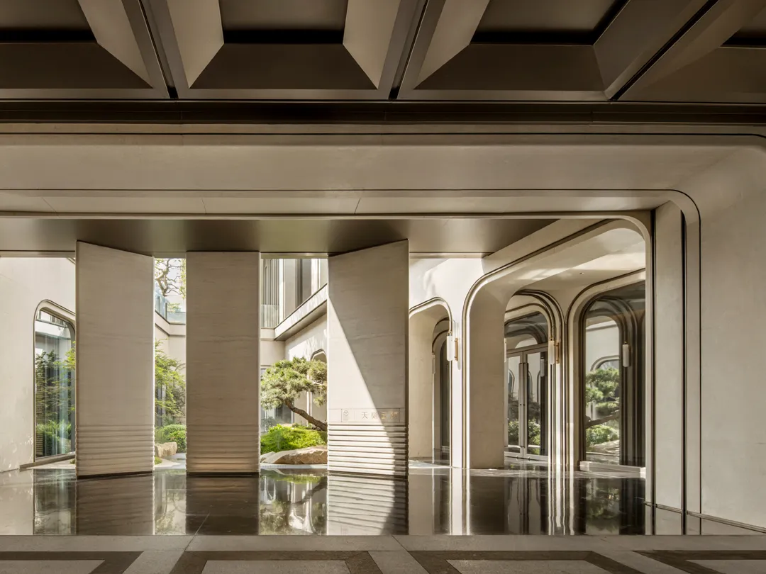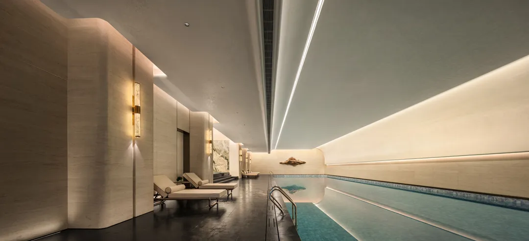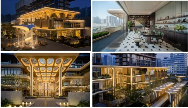 项目亮点:户型以 270°环幕江景为核心,全板楼布局实现户户无遮挡瞰江(如 199 平户型拥29.5米观江面宽),结合 3.55 米层高与独梯独户设计提升空间舒适度;创新“生机之环”地下空间通过四层通高森境谷庭、绿植瀑布将自然引入地库,形成艺术化归家动线;立面融合宋代《水图十二卷》长江意象,香槟色波浪铝板玻璃幕墙呼应江波纹理;双会所配置涵盖恒温泳池、私宴露台、室内高尔夫及赛事级篮球馆,延伸精英社交场景。