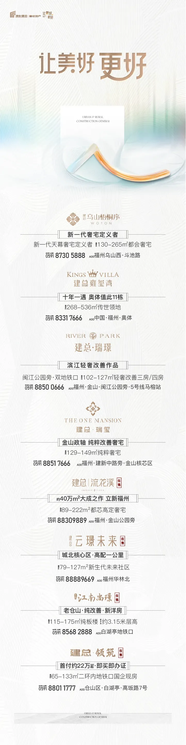 作为市属国企福州城投集团所属市城乡建总集团有限公司旗下企业,建总地产正以厚积薄发之势,在产品力、保价力、交付力与社群温度之间,用一座座看得见、摸得着、住得好的品质家园,为城市高质量发展写下温暖注脚,也为万千家庭托举起“此心安处是吾乡”的安居梦想。
