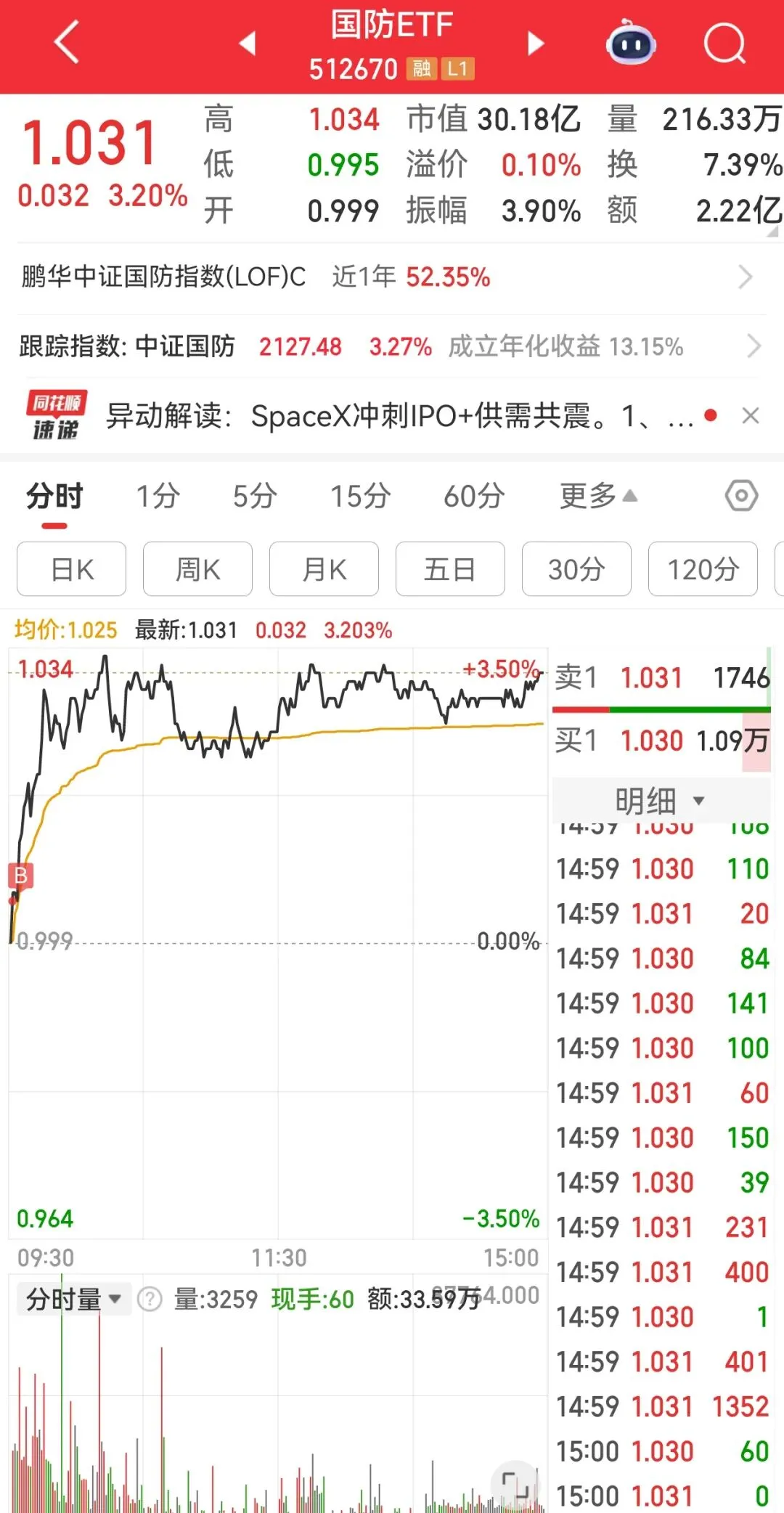 早盘买了点国防ETF,很小仓位,但确是非常确定的买入机会,大家可以从小周期切换到大周期看看。大仓位之前说了,都在煤炭ETF上 避险。